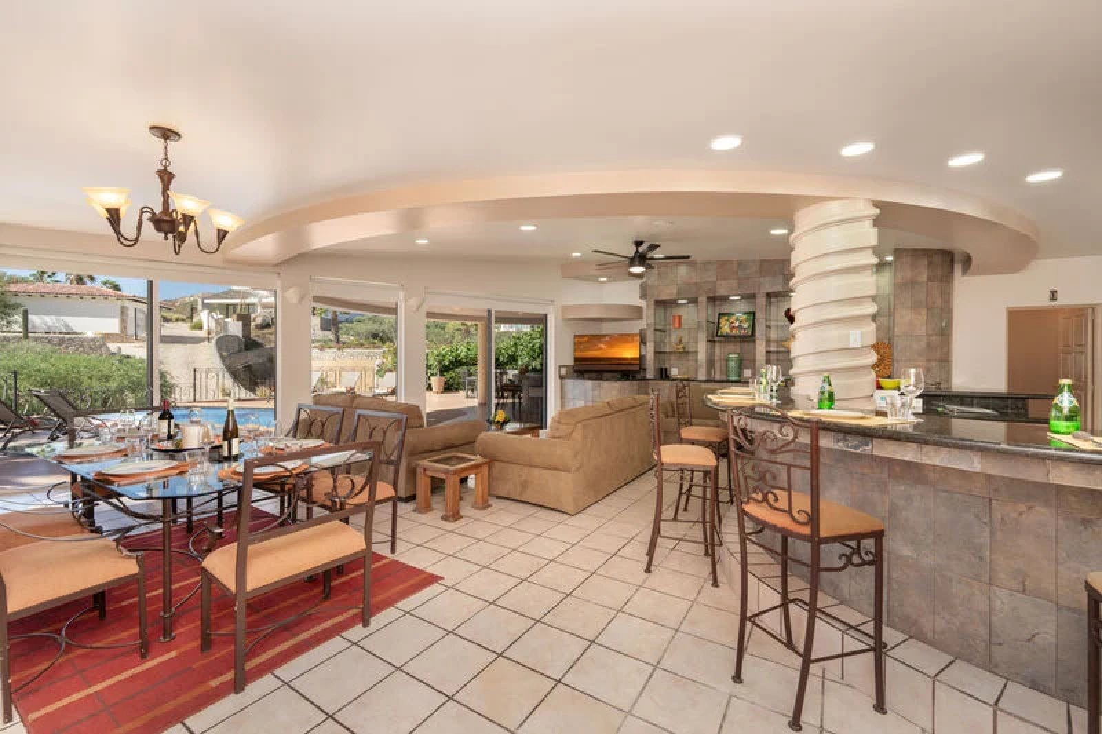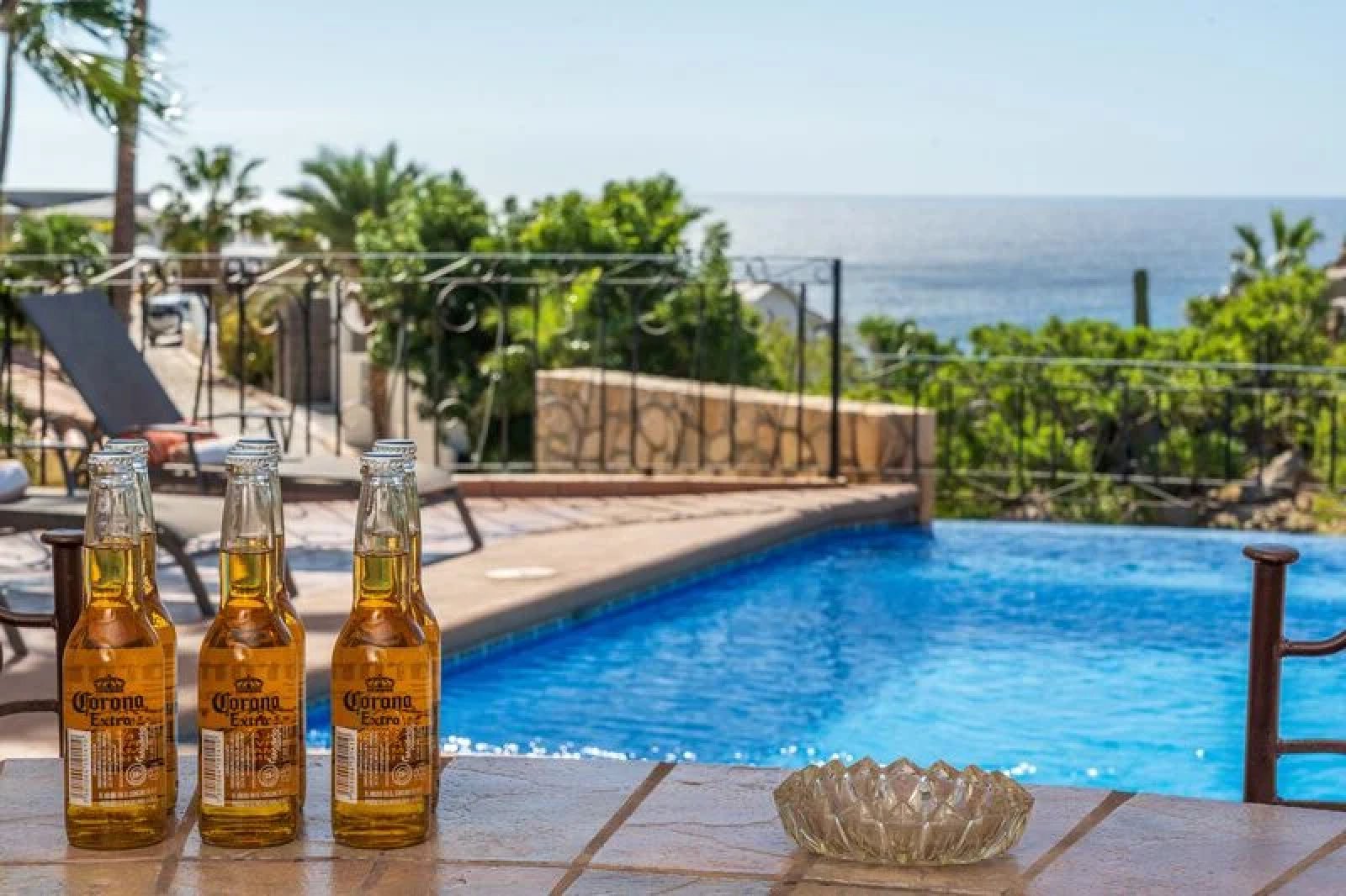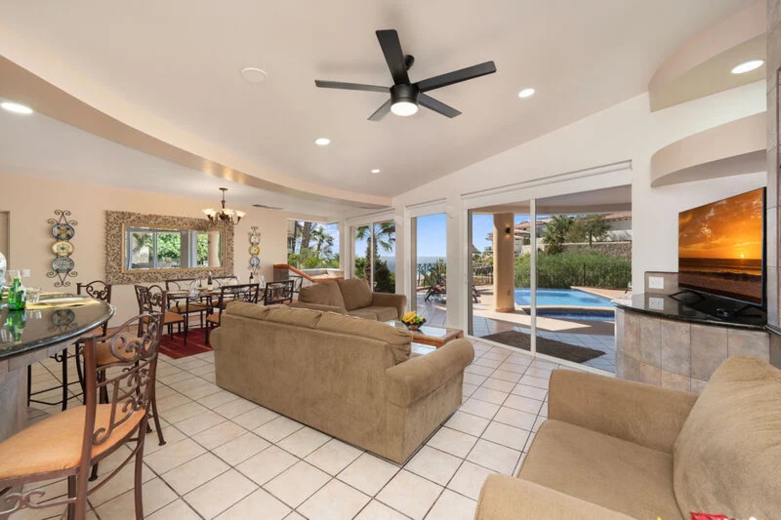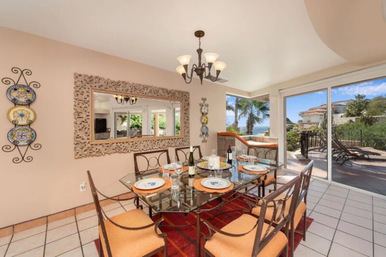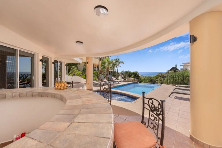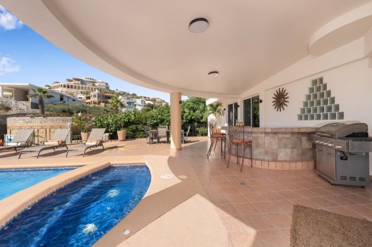 The back patio is everything you have dreamed of for your Cabo vacation, and features over 9,000 square feet of leisure space! Enjoy stunning views of the Cabo coast as well as a superlative perch from which to enjoy breathtaking sunsets. Guests will certainly enjoy the gorgeous swimming pool and the Jacuzzi that can fit up to six people. There is a BBQ and bar area, along with patio dining and eight lounge chairs, making the terrace the perfect spot to enjoy drinks and meals alfresco while taking in the spectacular views of the beach and ocean.