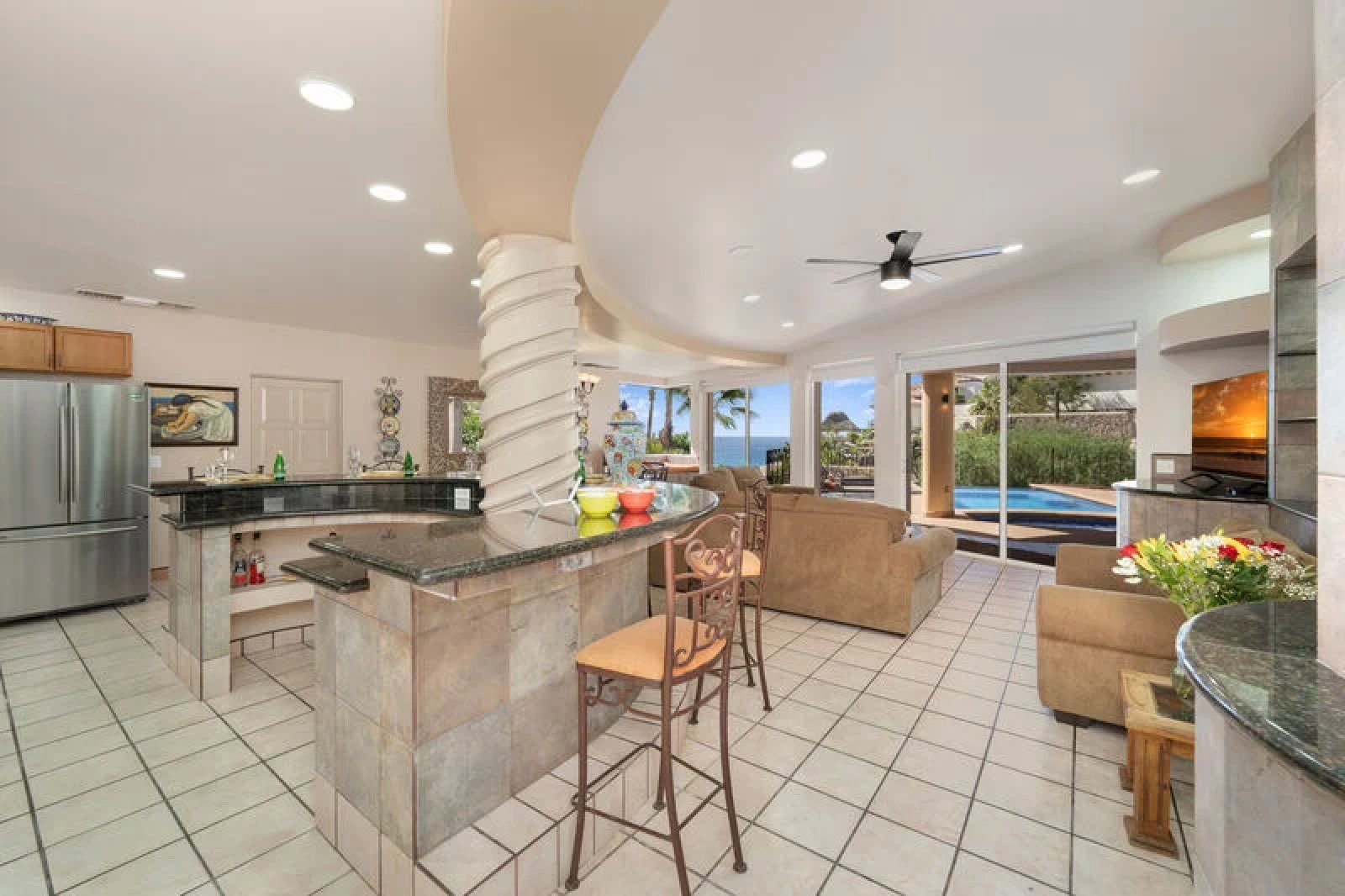 Pool • Hot Tub • Beach Access • Dining Table • Chaise Lounges • BBQ Grill • Shade Structure • Bar Seating