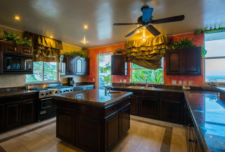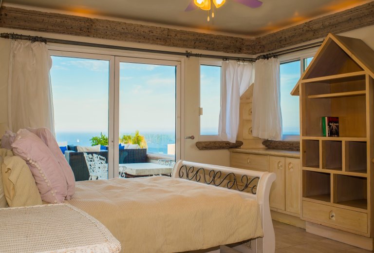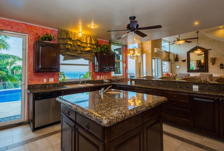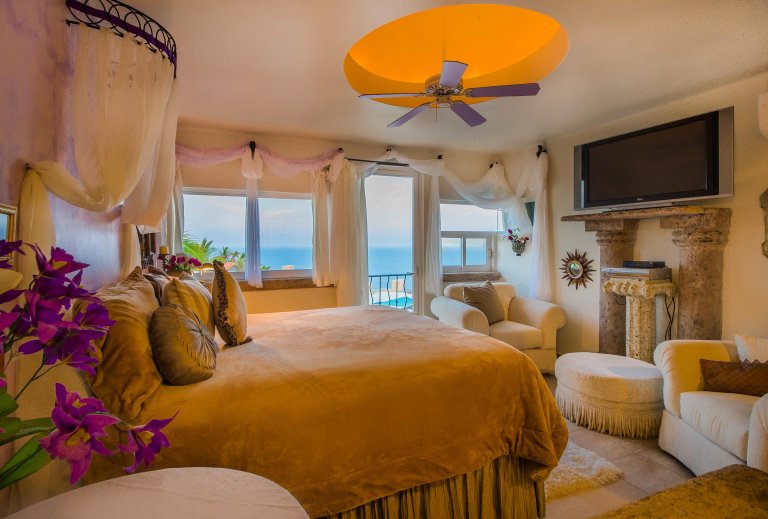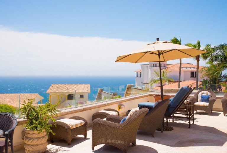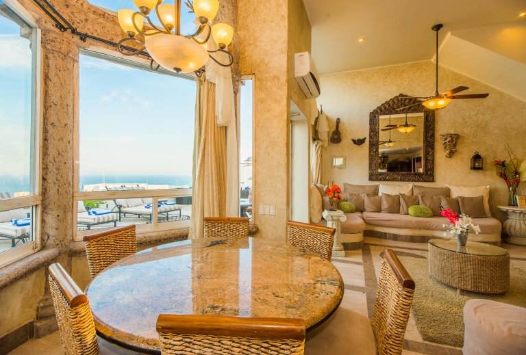 The interior of this Cabo vacation home consists of a gourmet kitchen, library, den and private bedroom suites. Large windows, high ceilings and an open-space layout give the home a spacious feel and relaxing setting. Striking marble and granite, plus artistic accents, create a unique designer vibe. Gather in the large living area or lounge on the outdoor furnished terrace. Breathtaking views of the ocean can be enjoyed from almost every part of the home and provide guests with a remarkably relaxing atmosphere.
