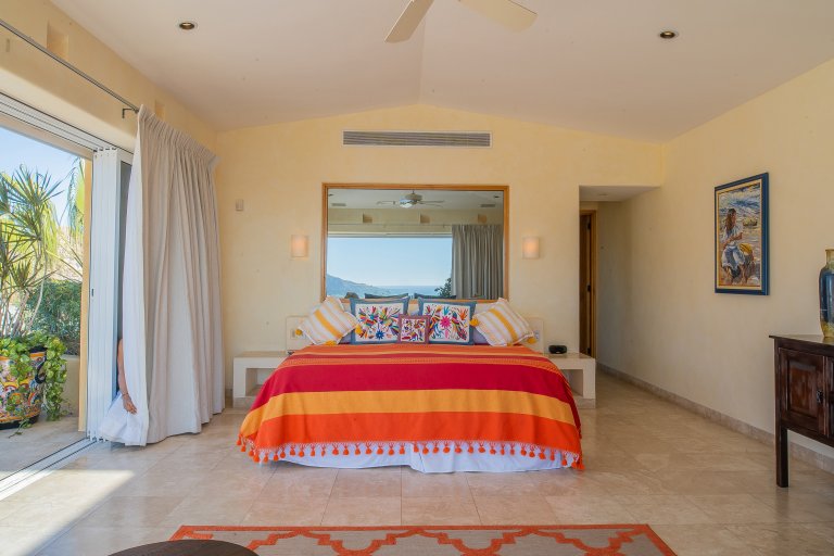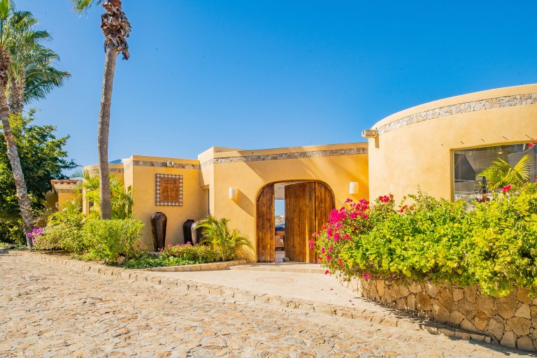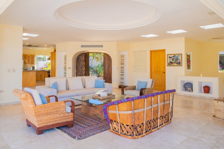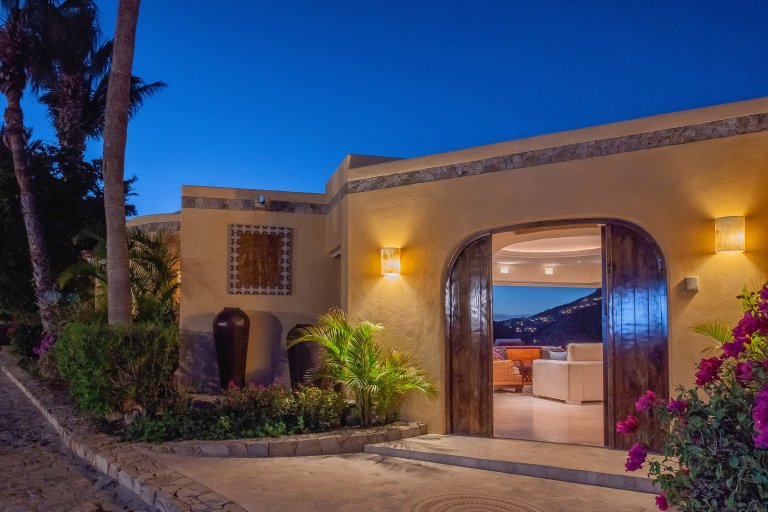 The villa boasts 6,700 sq. ft. of living space and allows for seamless indoor-outdoor year-round living for up to 11 guests. Approaching the villa from the cobblestoned road, one is greeted by a polished exterior, classically Mexican, with bright bougainvillea, palms, and decorative urns. The large wooden door opens into the airy and open interior, and commanding views.