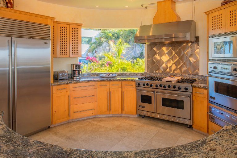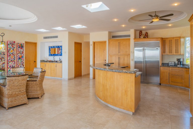 The kitchen and main living areas are open, bright, and airy. Skylights bring light into the great room, while a wall of folding doors allow the views the serve as a perfect backdrop for cocktails in the sitting area and meals at the dining table. Throughout the home, traditional Mexican handicrafts create vibrant accents to each room.
