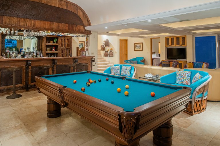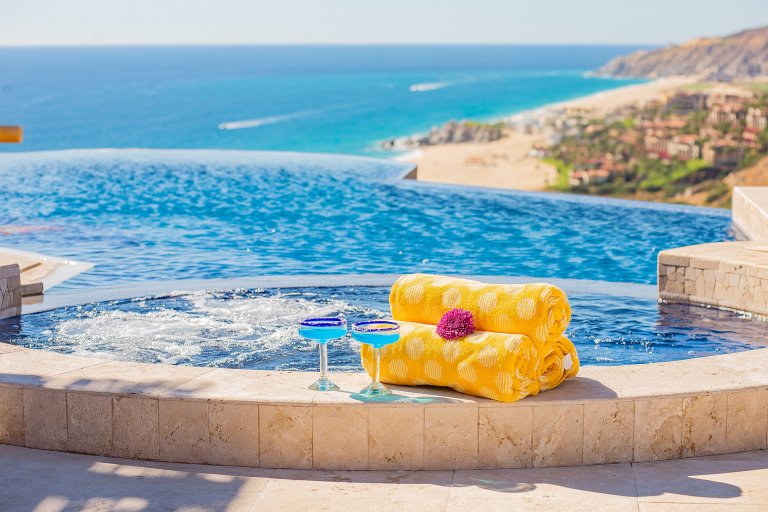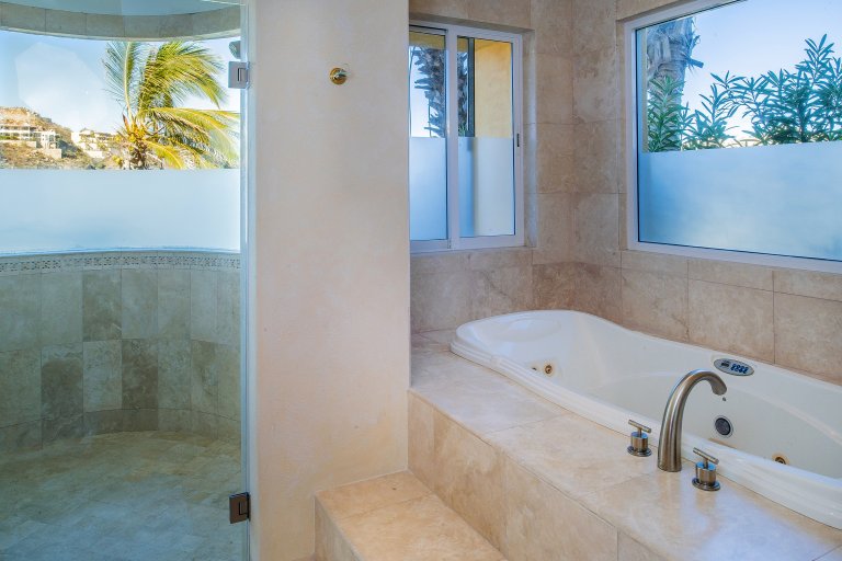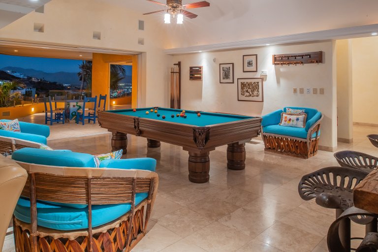 Out on the stunning, upper-floor terrace, the home’s luxurious infinity-edge pool and jacuzzi allows guests to swim and luxuriate while enjoying the stunning views. Chaise lounges allow sun worshipers to soak up the warm Cabo sunshine while the overhanging roof affords the ability to pull a lounge chair into the shade for a relaxing read or afternoon nap. The openness also allows guardians to watch younger guests in the pool.