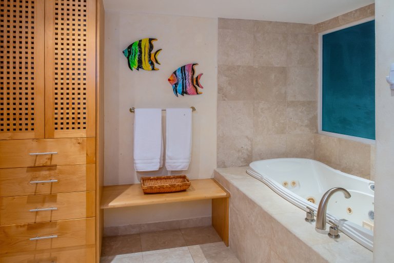 The home’s four bedrooms are appointed with comfortable bedding, en-suite bathrooms, and direct access to the terraces. On the upstairs level, adjacent to the main living area, a bedroom offers a king-size bed, twin-sofa sleeper, and retractable doors creating an open feel and the ability to take in the beautiful views right from bed. There is an additional king bedroom located upstairs, meanwhile downstairs, one bedroom is furnished with a king-size bed, will a third offers two full-size beds.