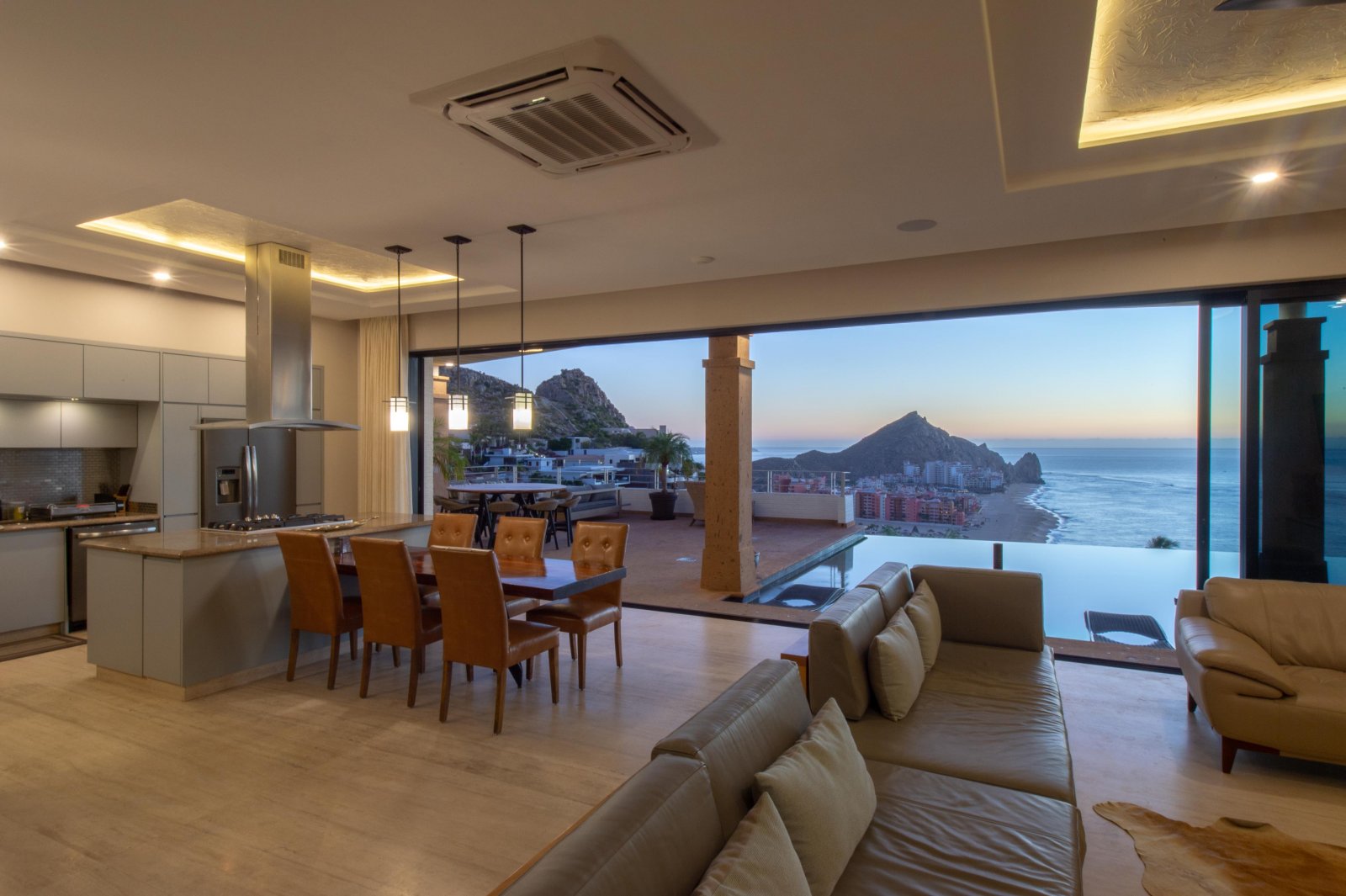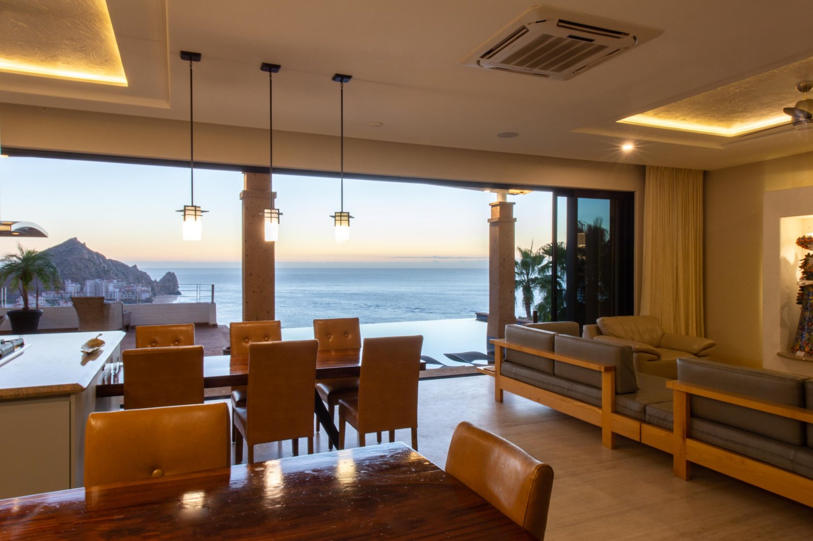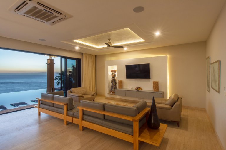 Pocket doors allow ocean breezes to cool off the indoors and make it easy for guests to move between the terrace and the living room. The living room has a large couch, two leather armchairs, and striking artwork. Sit in this room to enjoy the large, flat screen TV mounted on the wall. Cabo Villa Jade also has a den where guests can relax together.