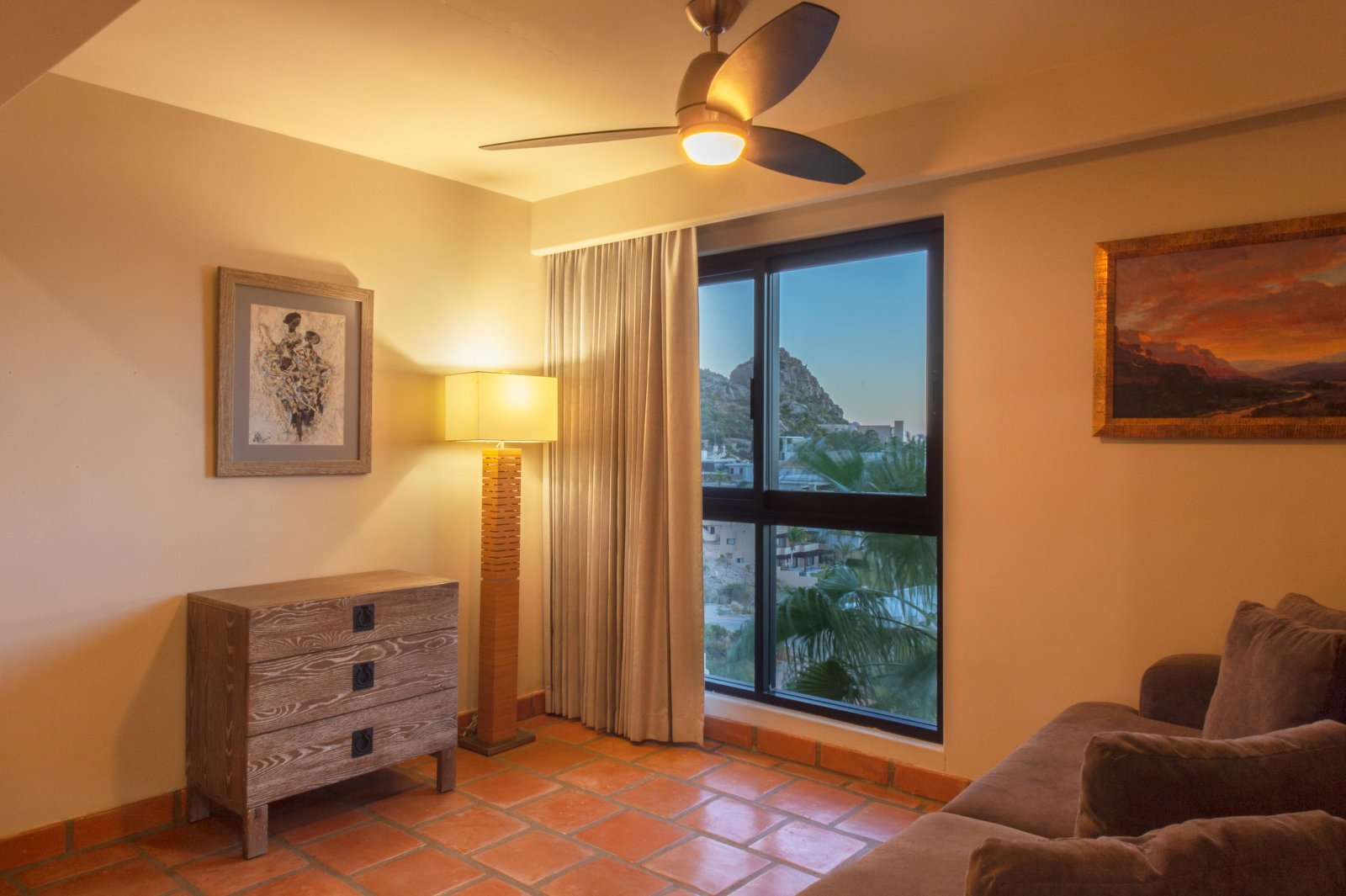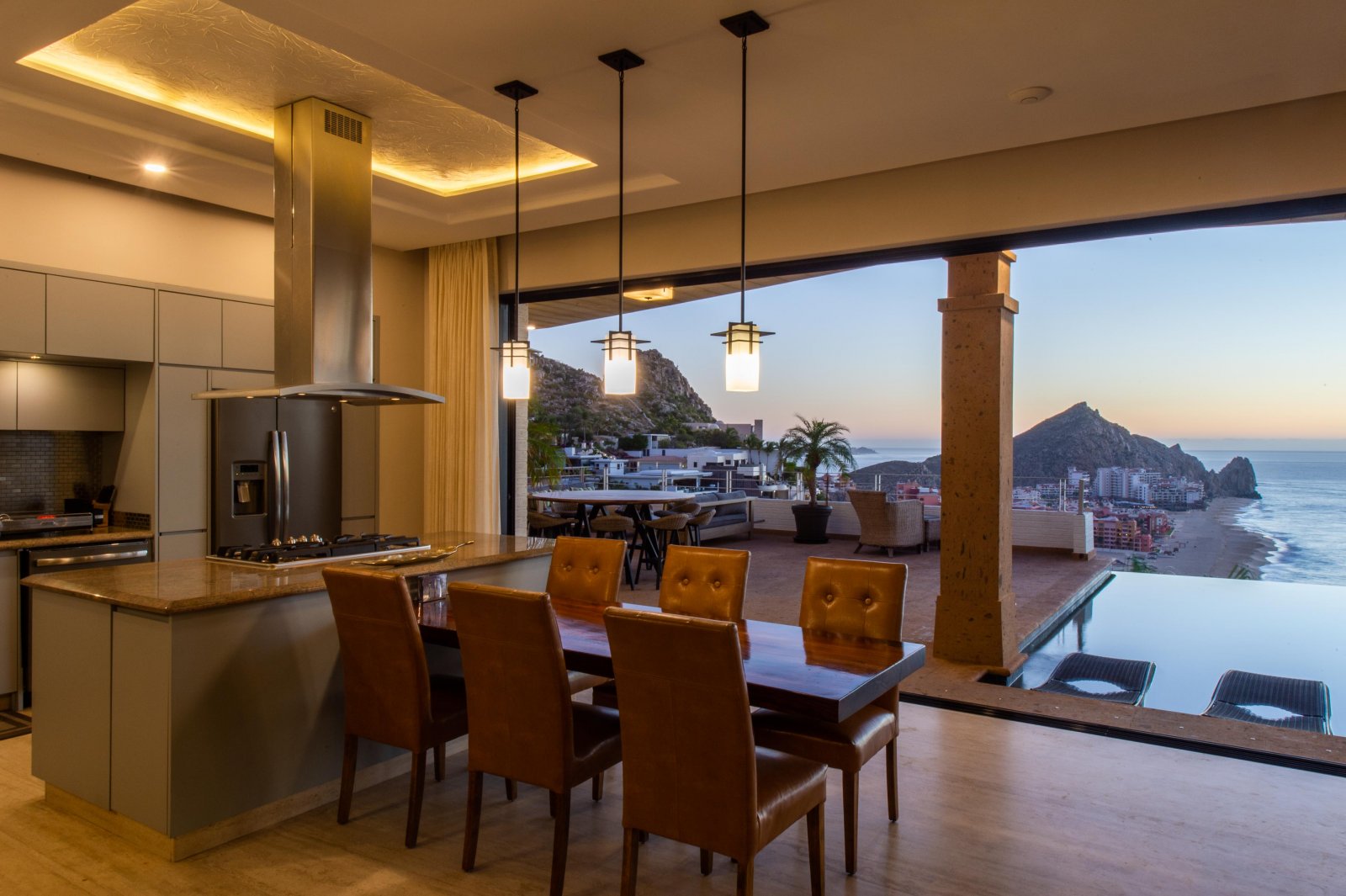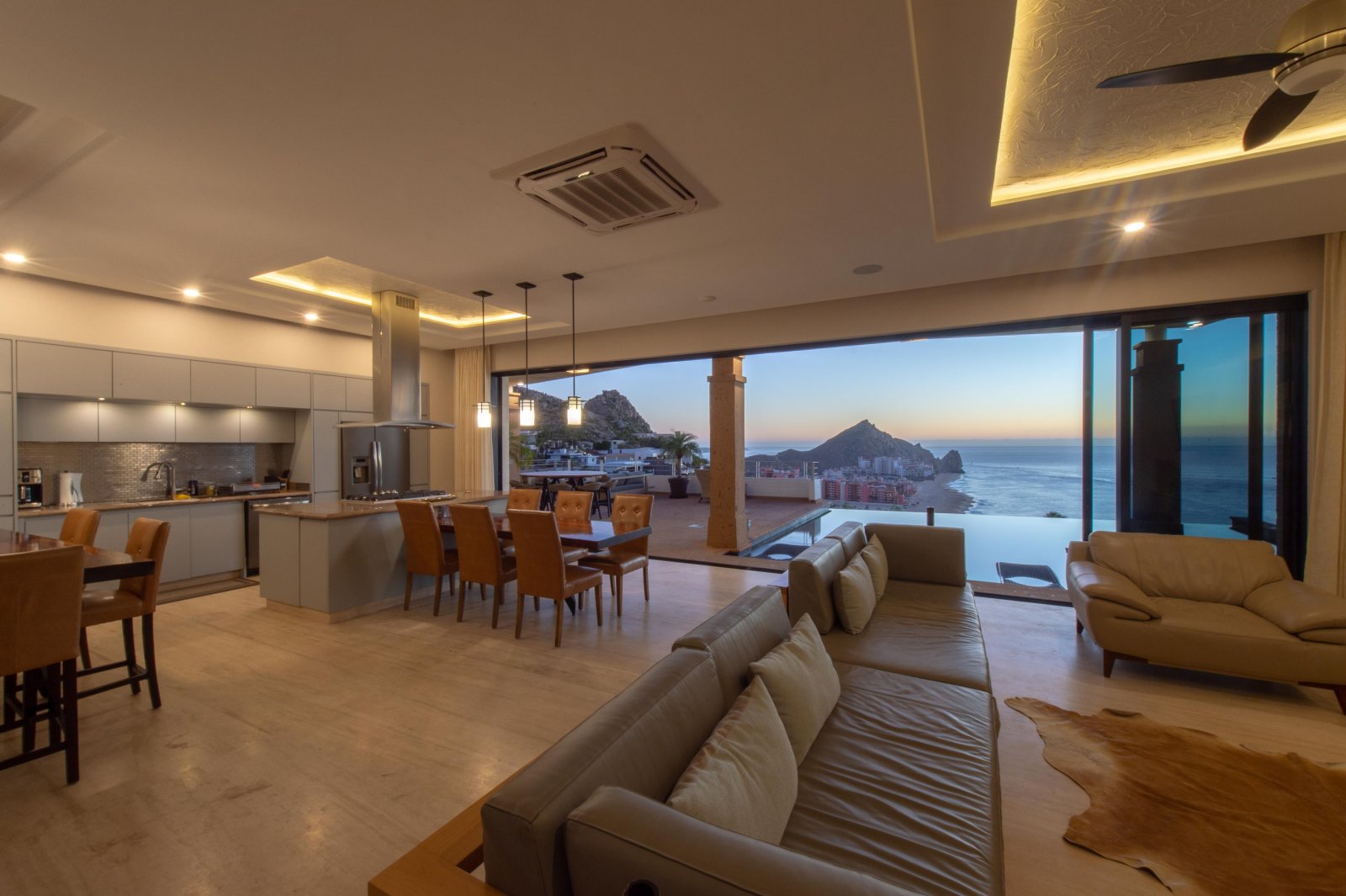 Pocket doors allow ocean breezes to cool off the indoors and make it easy for guests to move between the terrace and the living room. The living room has a large couch, two leather armchairs, and striking artwork. Sit in this room to enjoy the large, flat screen TV mounted on the wall. Cabo Villa Jade also has a den where guests can relax together.