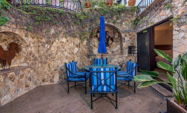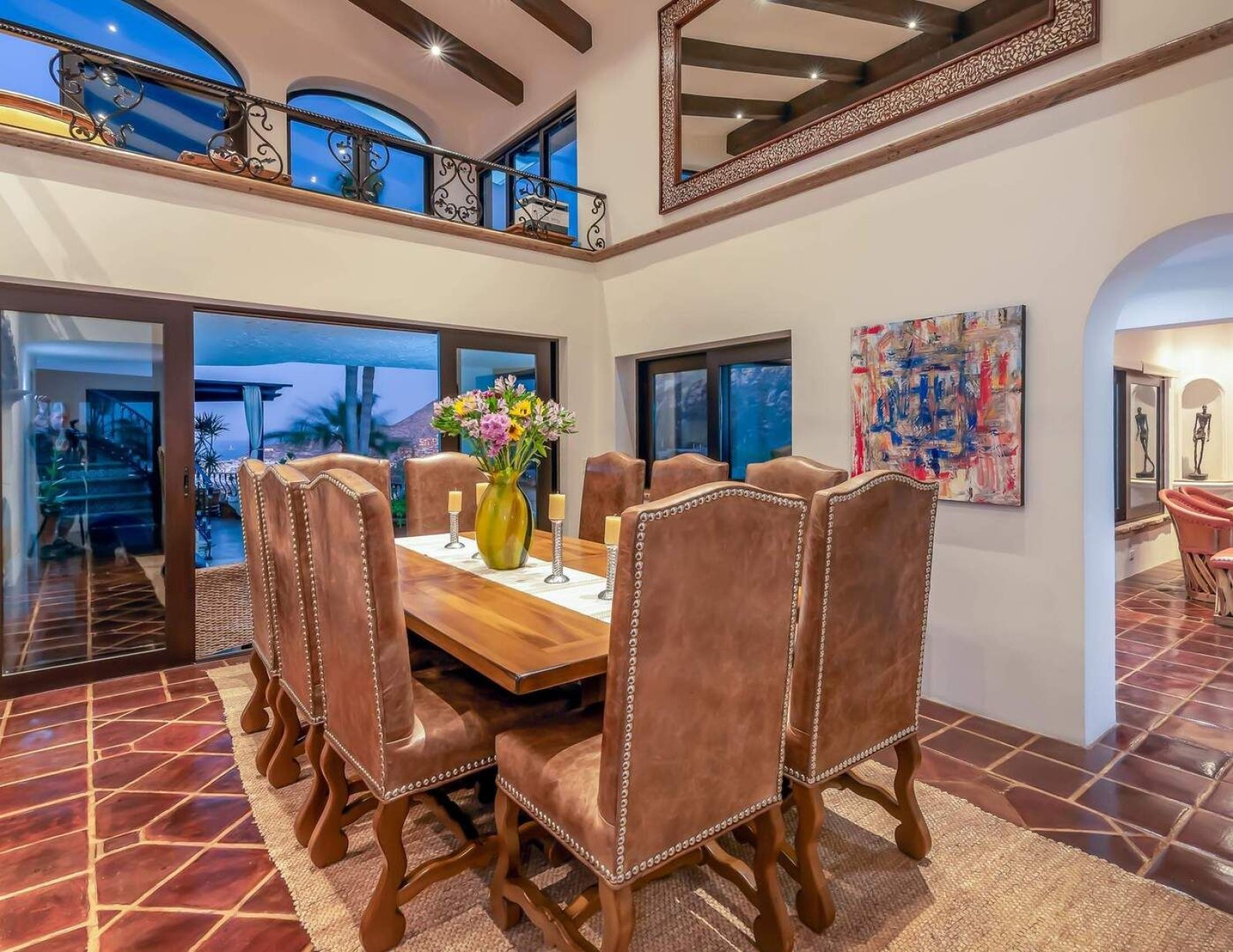 Rustic and rich wood cabinets line the walls of Casa Connie's kitchen. Featuring plenty of counter space and modern, stainless steel appliances you can effortlessly create gourmet meals to wow your friends and family. Move into the dining room for a more formal, sit-down meal at the grand table with seating for up to eight guests. The living area of Casa Connie includes an array of plush sofas, so you can relax while still taking in the views from the terrace through the large windows. From the living area, a spiral staircase will take you to the upper level of Casa Connie. Take a moment to appreciate all the unique paintings and works of art that are found throughout the home.