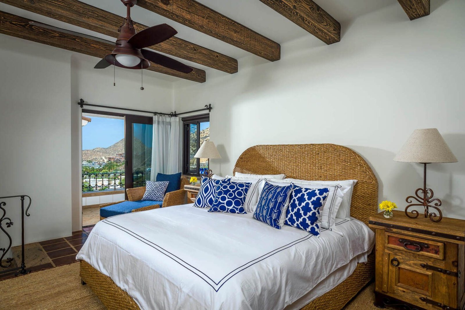 An expansive King size bed can be found in each of the bedrooms at Casa Connie. Spend your nights lounging or snoozing on the beds that have been outfitted with plush pillows and crisp white sheets. Feel as if you are laying outdoors in the Master Bedroom with a ceiling that has been painted to resemble a cloud-filled sky. Large sliding glass doors against one wall of the Master bedroom lead out onto a terrace where you will find a private, more secluded pool. Ensuite bathrooms, TV's, private terraces, and lovely views can be found in all the bedrooms of Casa Connie.