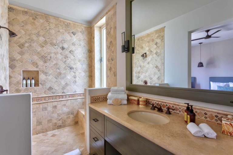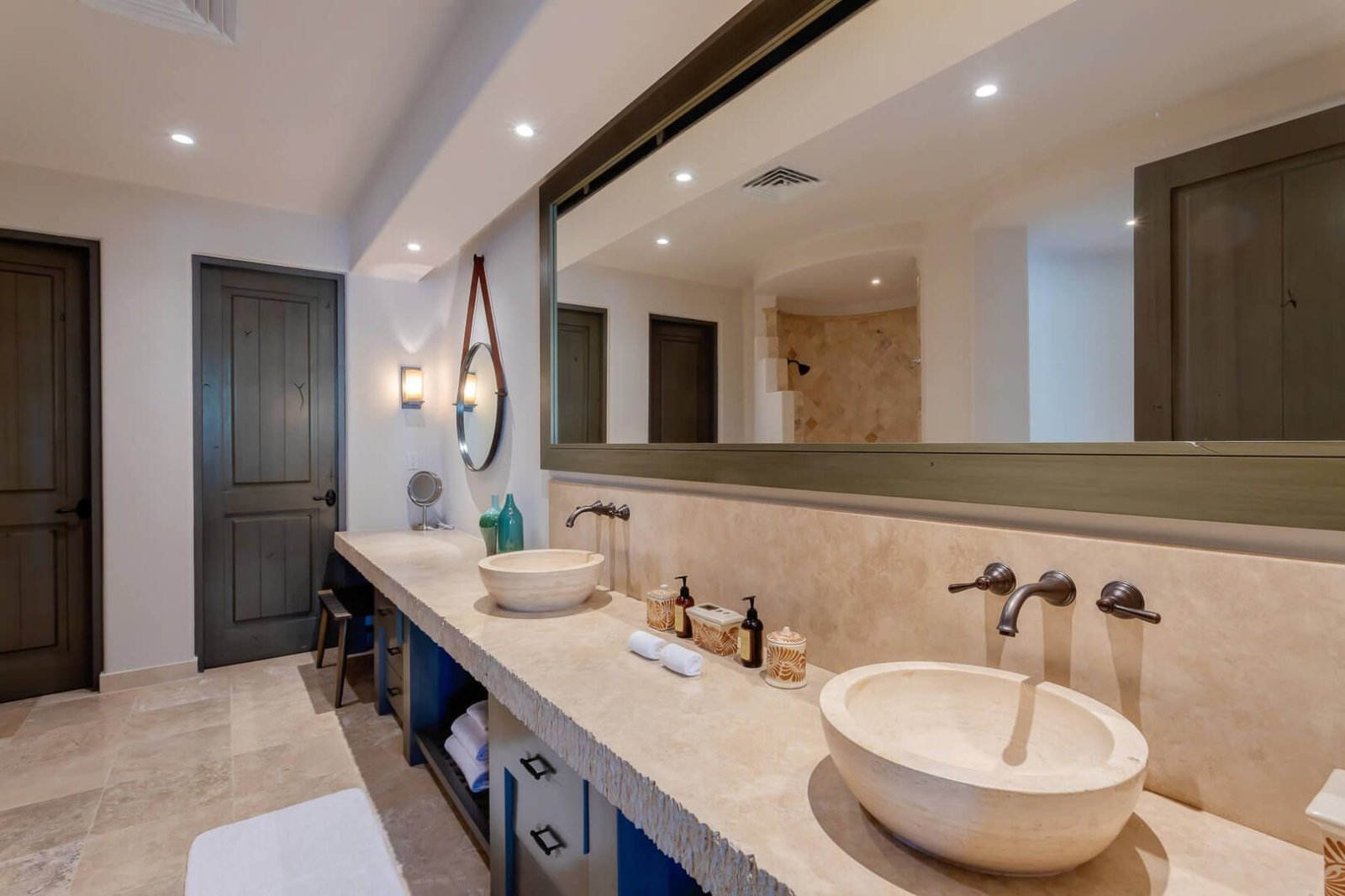 In each of the 3 spacious bedrooms, you will find opulent furniture and decor that reflects the design of the entire property. Lavish linens and plush pillows can be found on both King beds and the 2 Double beds of Villa 2601. All 3 rooms include their own ensuite bathroom, so everyone can have their own space to get ready. Wide sliding glass doors let the warm Cabo sun into the bedrooms and allows the spaces to feel bright and open.