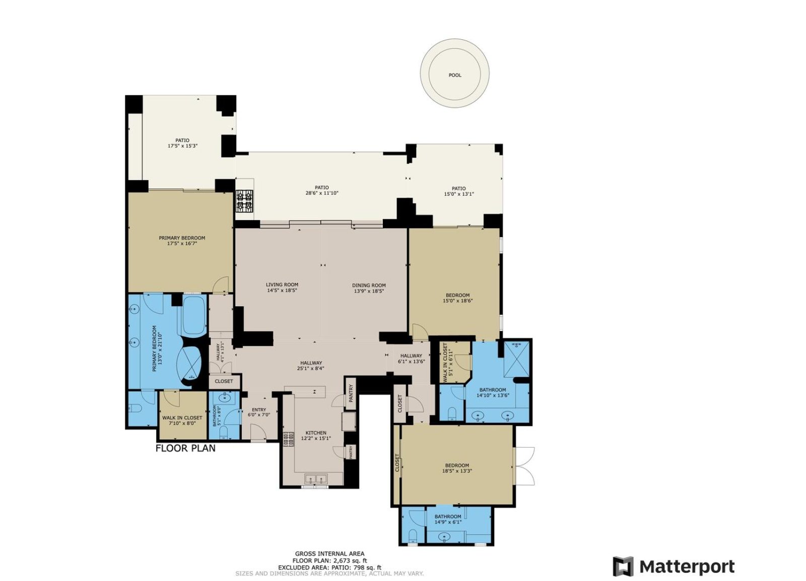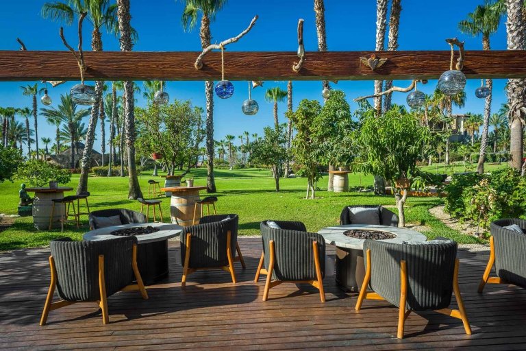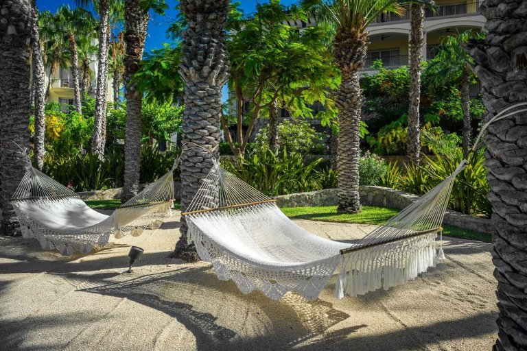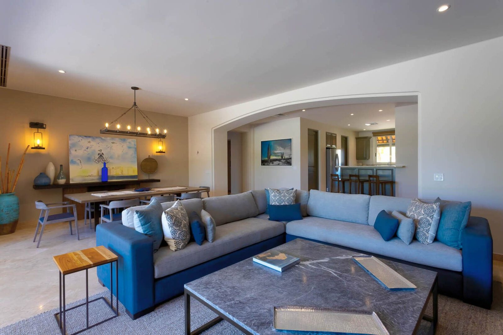 From the living and dining area, you will also find floor-to-ceiling windows that open out onto a stunning patio facing the Esperanza gardens. Out on the patio, you will find even more plush cushions and a table with seating for six. Take advantage of fantastic outdoor space and more when you stay at Villa 2601.