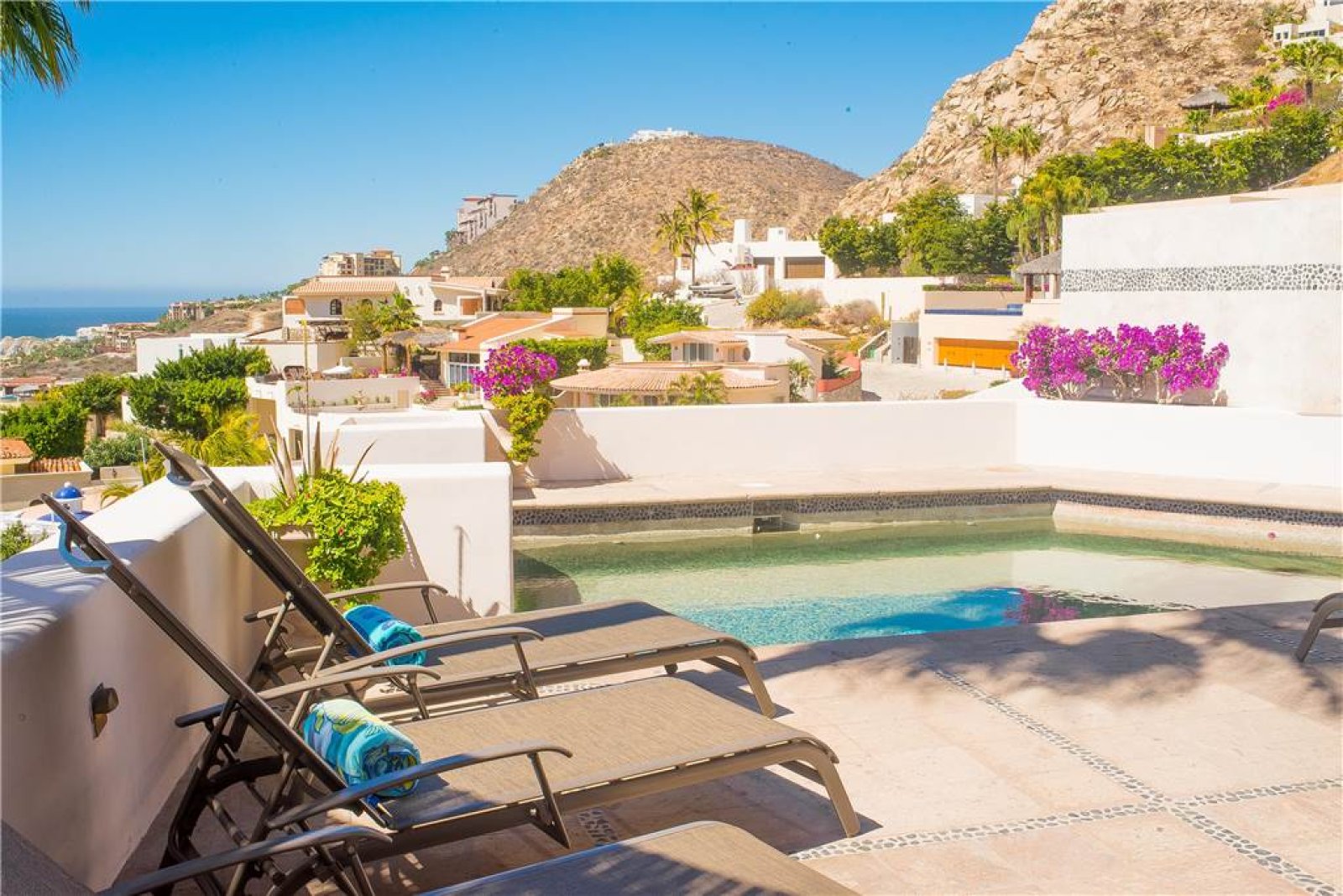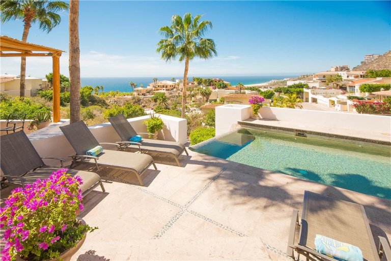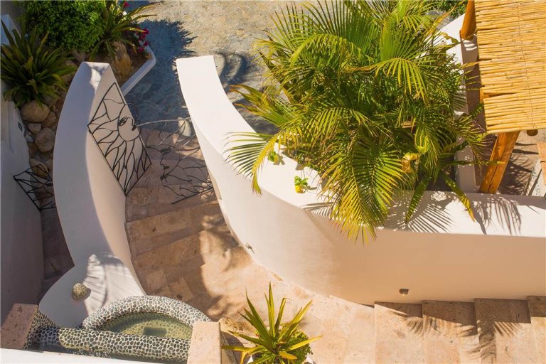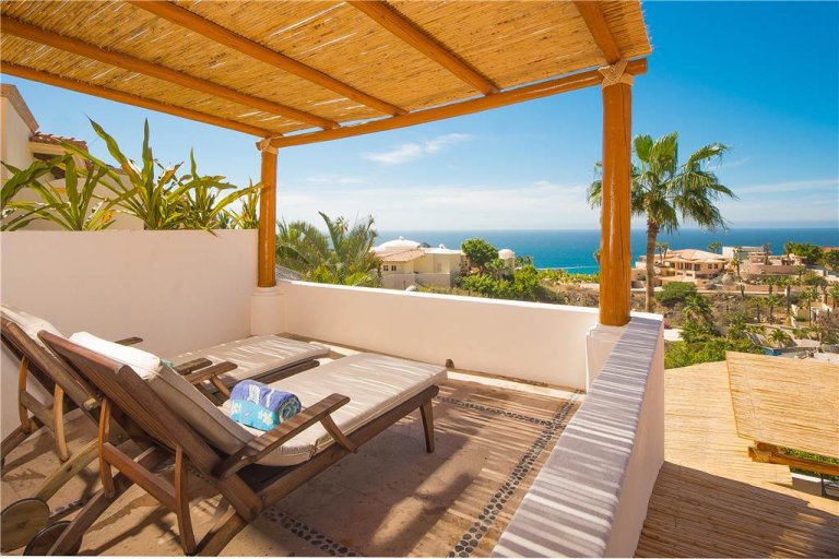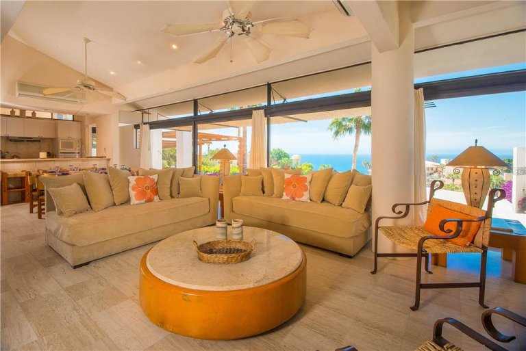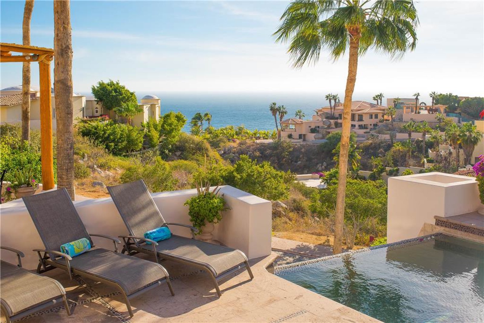 Let the gentle ocean breezes caress you while you enjoy the gorgeous views of the Pacific from this lovely hillside villa. Or, take in the view from the floor-to-ceiling windows inside. With its built-in bar, entertainment center, and living area that opens onto a large patio with pool, you’ll appreciate the quality and style of this ideal Pedregal home. Most of the villa’s spacious bedrooms have beguiling ocean views, and all have private bathrooms. There are also spectacular views from many vantage points on the property, but if you really can’t get enough of those sparkling blues, you merely have to take a short stroll on a private road that leads directly down to a scenic beach. Hanging around outside the villa has its perks too, with its infinity pool and the alfresco dining for 8 under the cozy palapa. The villa’s grounds are appealingly landscaped—in fact, “appealing” is a word that suits this villa perfectly. From its striking hillside setting to its travertine floors, Villa del Sol is an attractive home that will fulfill all your getaway needs.
