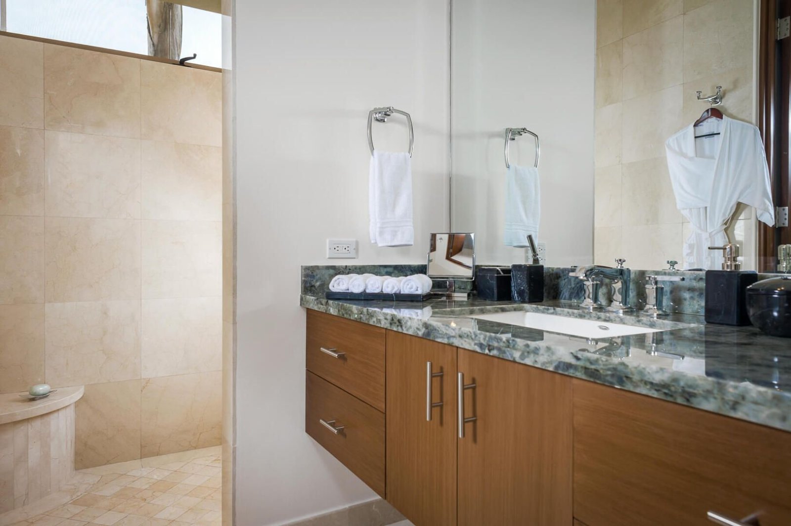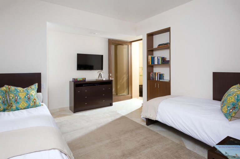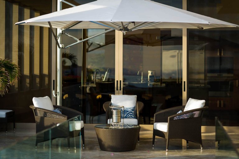 The ultra-posh outdoor spaces at Pacific West radiate style and a cool resort vibe. Shaded by crisp white umbrellas, lounge beds and casual seating areas dot the terrace. There is also a lush green lawn on the bottom level, a series of private patios and terraces off the bedrooms, and a spacious main terrace that features Pacific West's superbly elegant pool. With a long, sinewy design, capped by a short infinity-edge and a series of waterfalls pouring out of the stone facade, the pool is reminiscent of a luxurious Roman bath.