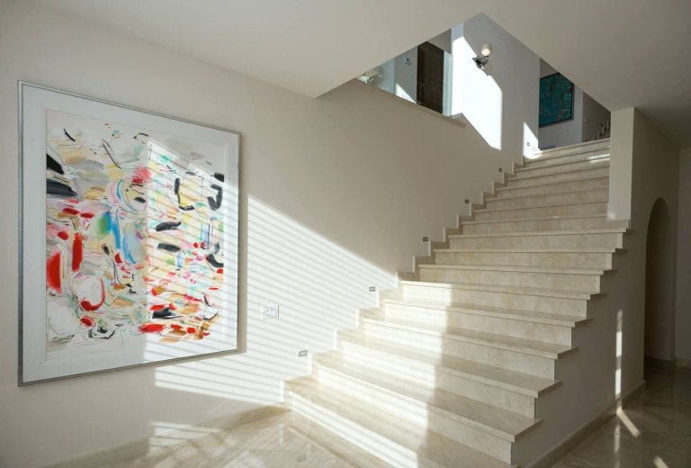 A contemporary architectural masterpiece, Pacific West features clean lines, stylish interiors and beautiful natural surroundings. Soaring palm trees line the drive, gently swaying with the warm ocean breeze. Inside the home, fresh, modern decor infuses every space with style and sophistication, while the neutral tones in the floors and walls create a calm, refreshing ambiance. Colorful artwork punctuates the blank canvas of cream walls, and the terraces on each level are fringed with greenery and bright pink bougainvillea.