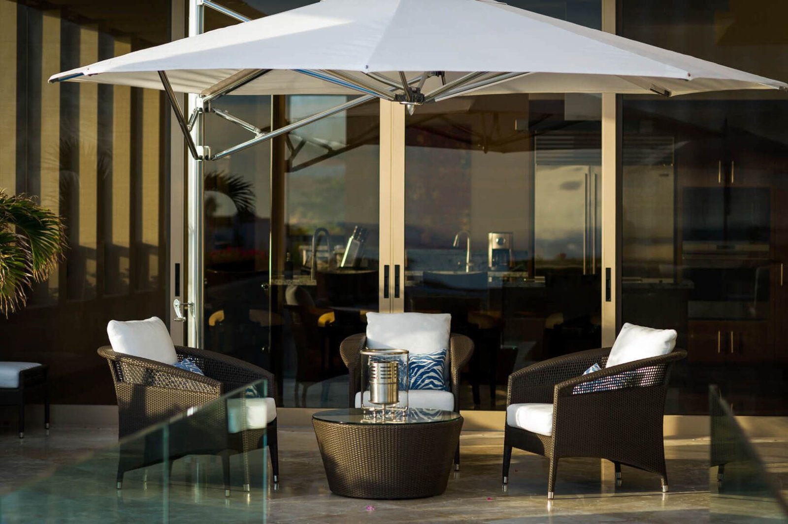 Massive glass windows reveal ocean views from every corner of the open-concept living and dining area. The glass-topped dining table reflects the blue tones of the sea and sky, inviting formal dining for eight in a beautiful setting. The windows open onto the main terrace, where guests can grill up a feast on the deluxe gas BBQ and then dine under the stars around the outdoor table.