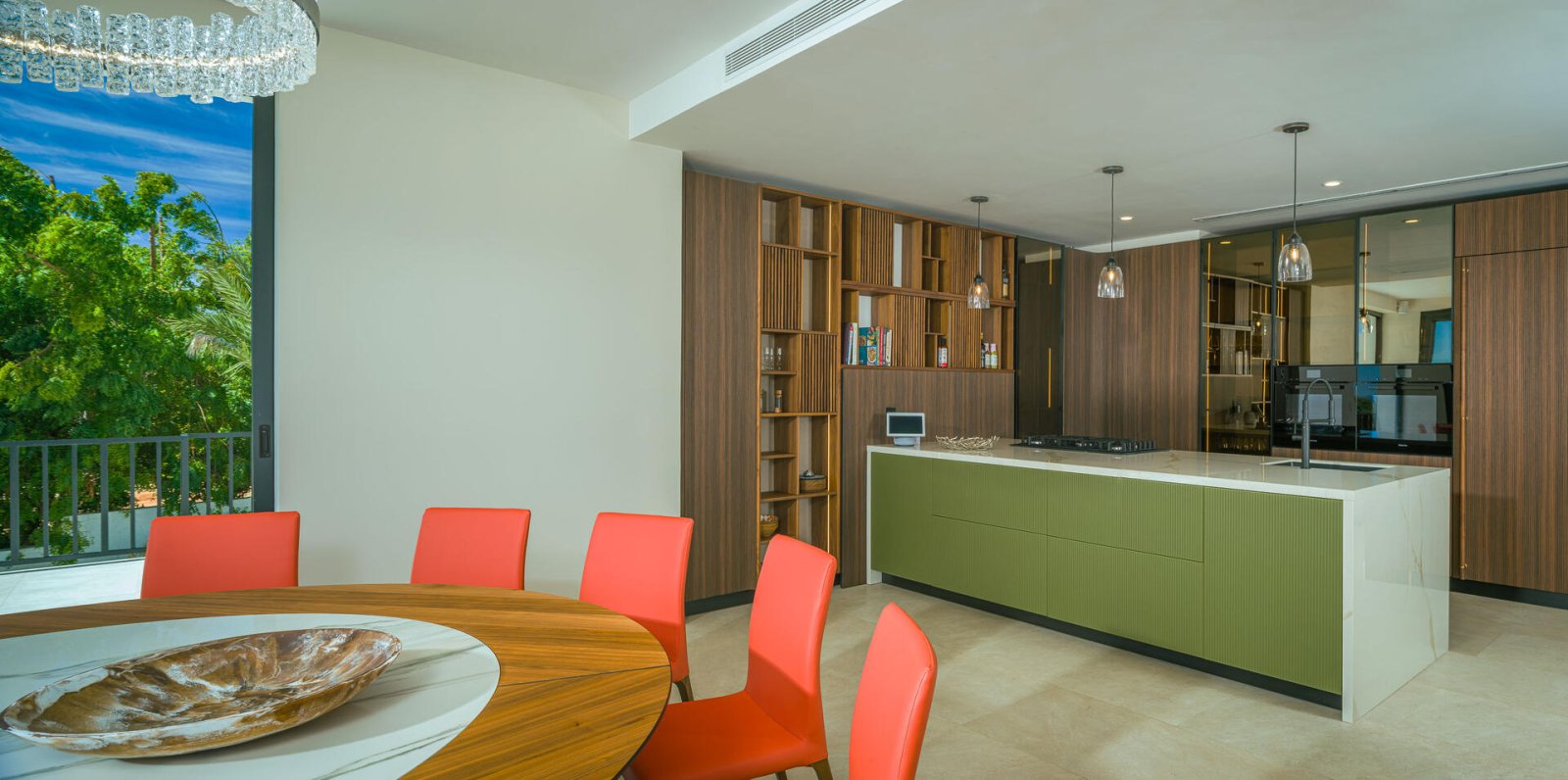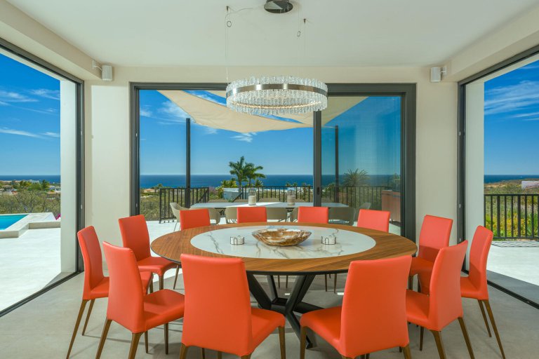 The open concept living and dining area, makes the most of the stunning views of the Sea of Cortez. The layout of Casa Alba engenders an indoor/outdoor lifestyle. Whilst there is zoned air conditioning throughout, guests can also slide back the floor to ceiling windows and let the refreshing sea breeze blow through the house. Grab a yoga mat and head out to the terrace for salutations as the sun comes up!
