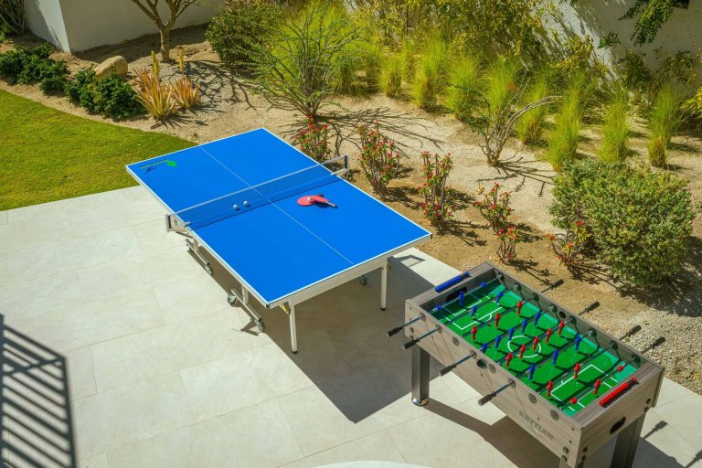 At Casa Alba, the entertaining space extends outside onto the expansive terrace, with another 12-seater table located next to the outdoor kitchen, complete with a Wolf gas grill and sink. Enjoy the heated pool, jacuzzi or lay in one of the lounge chairs shaded by large beach umbrellas. Then, after playing ping pong or foosball at the house, relax and enjoy a glass of rosé in the shaded seated area or sundowners around the firepit, then head inside to the media room and watch a movie.