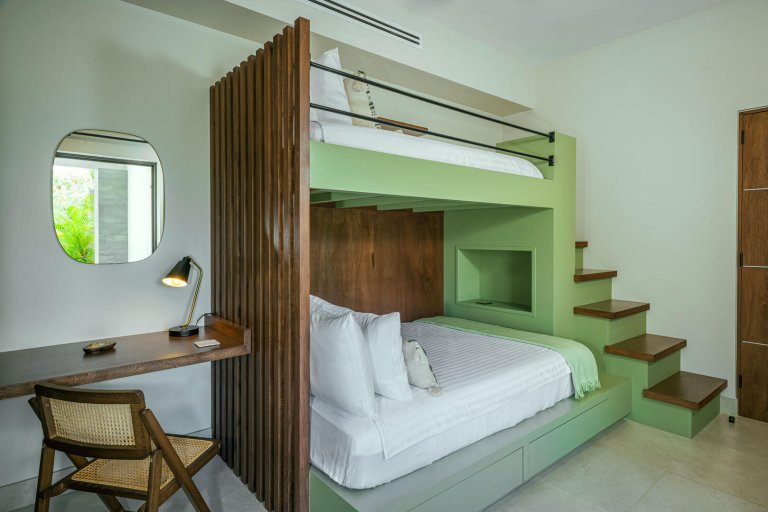 All bedrooms feature crisp white linens, tastefully complemented by cushions and throws in earthy tones of orange and green. 3 of the bedrooms have King beds (1,2 & 3) with bedroom 4 offering a modern take on the bunkbed (single and double beds), bedroom 5 has a queen bed and another two queens in the garden room (bedroom 6). All offer newly fitted bathrooms, with bedrooms 1, 3, and 5 also having outdoor showers.