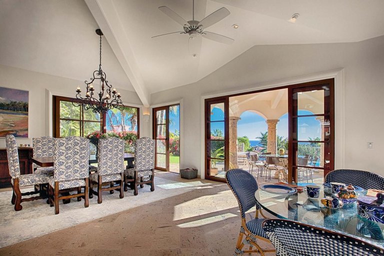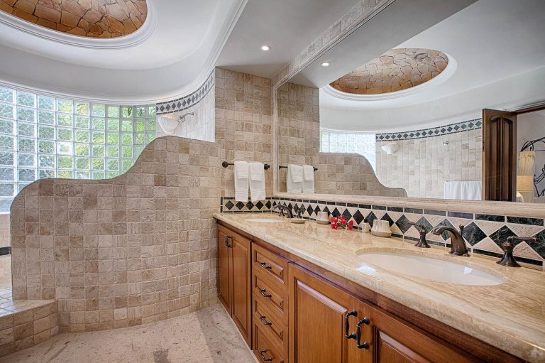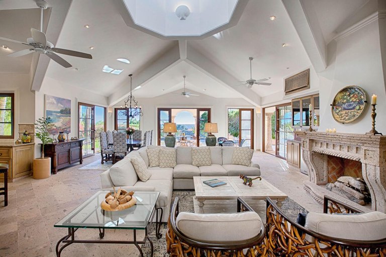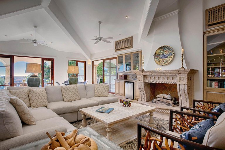 Back inside, the private bedroom suites are all unique, from the elaborate four-poster bed in the master to the intricately carved wood furnishings in some of the twin bedrooms. With high attention to detail evident throughout the home, the main living space is essentially one open design, including a gourmet kitchen with an island and extra seating, overlooking a tasteful dining table for eight. The space extends to include an upscale living area with an L-shaped couch, built-ins, a graceful fireplace, and a dramatic ceiling that almost becomes its own piece of art as it extends upwards until its eventually framed by skylights.