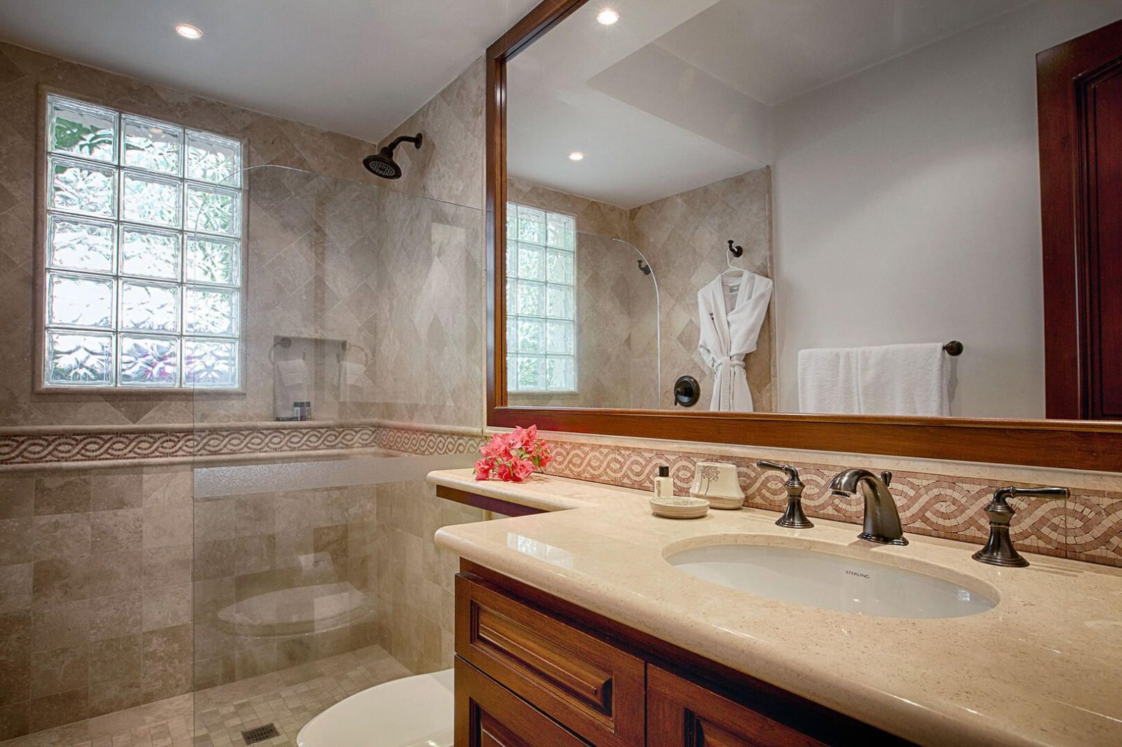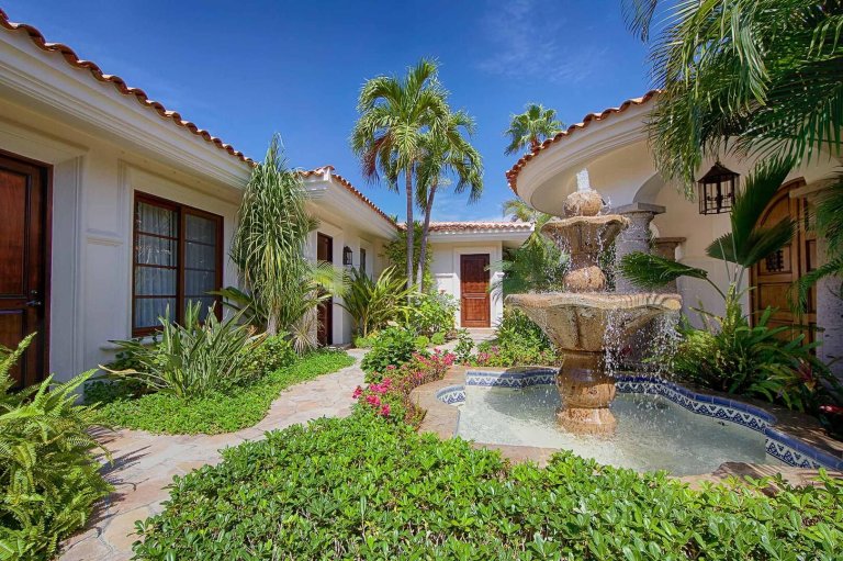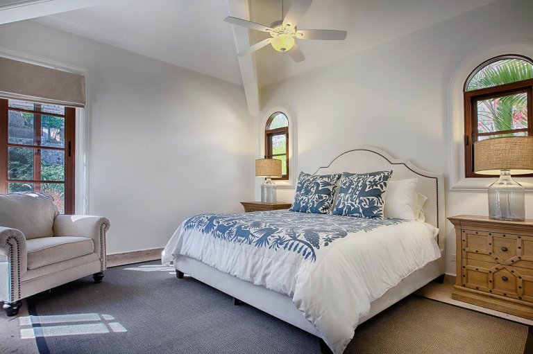 Take the stone pathway as it passes by a tranquil fountain and on to the rest of the villa, eventually connecting to an impressive five-bedrooms, 5.5-baths, and enough room to easily house up to 10 guests. Just as rewarding as the entryway is the back of the home, which peeks out over the surrounding rooftops and landscaping to the blue waters beyond. The outdoor space makes way for a gracefully curved, heated swimming pool and Jacuzzi, partially framed by a stone sundeck, four relaxing deck loungers, an outdoor grill, and a shaded dining table for gourmet meals under the stars. This extremely private space is completed by even more landscaping, including towering palm trees that flank the arches and columns that give this villa its own distinct design.