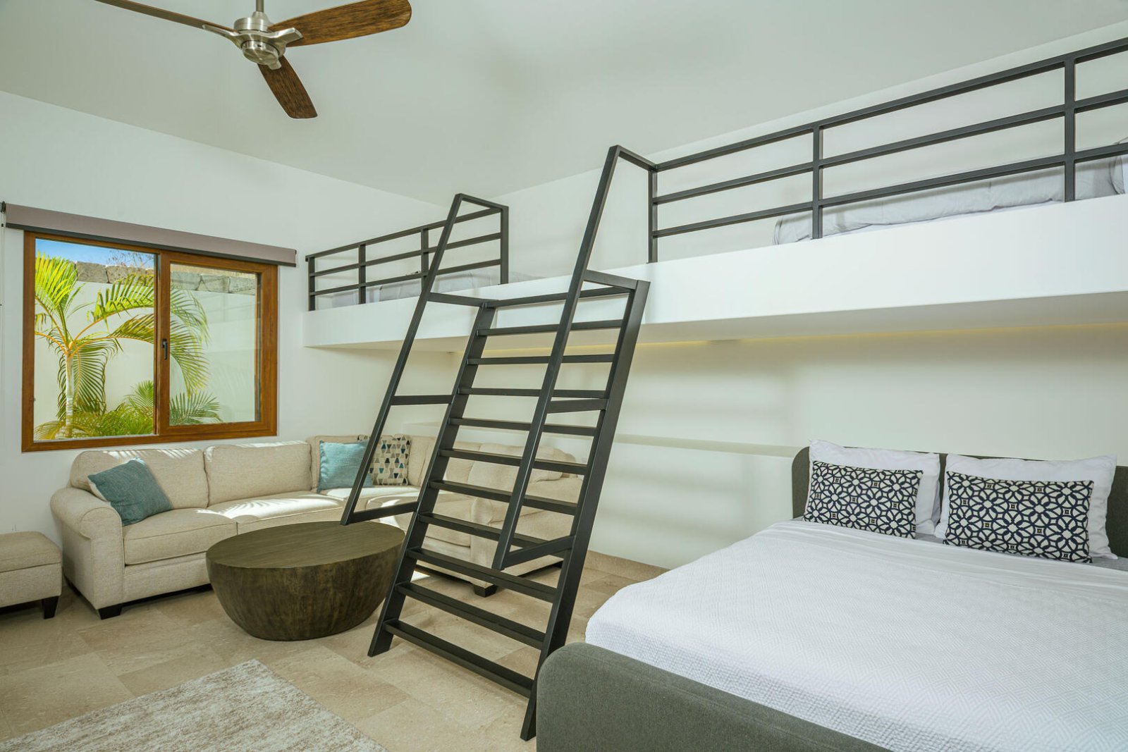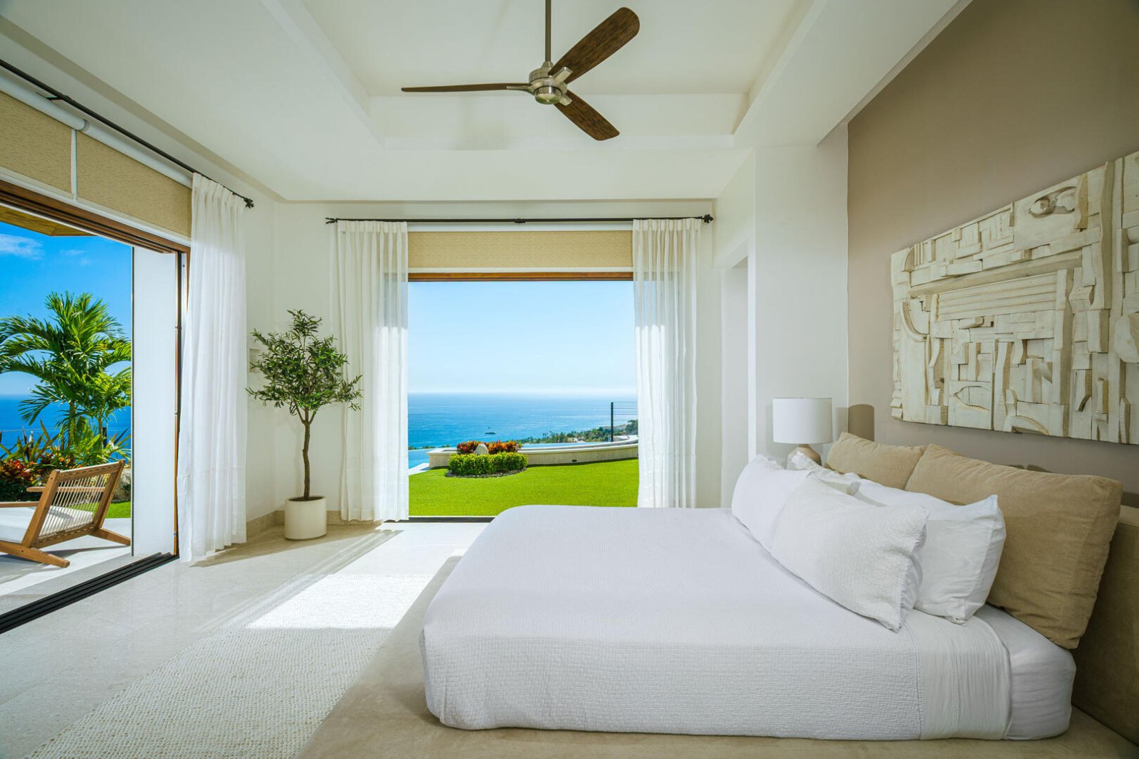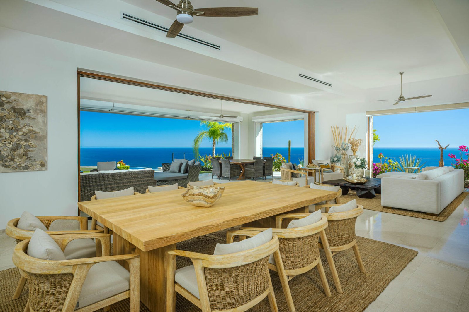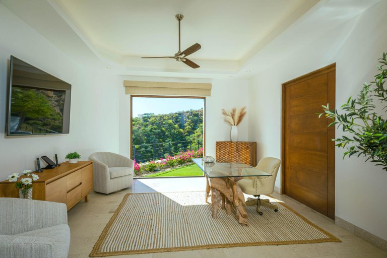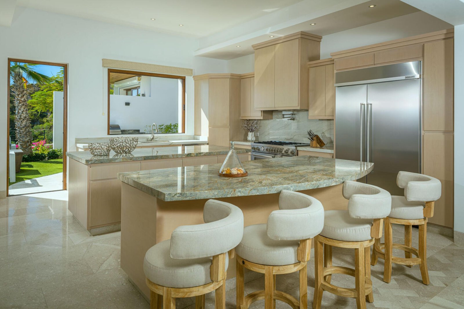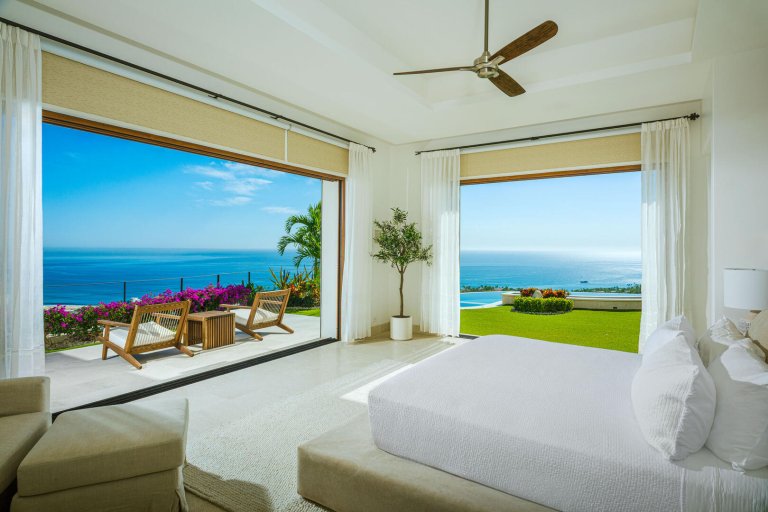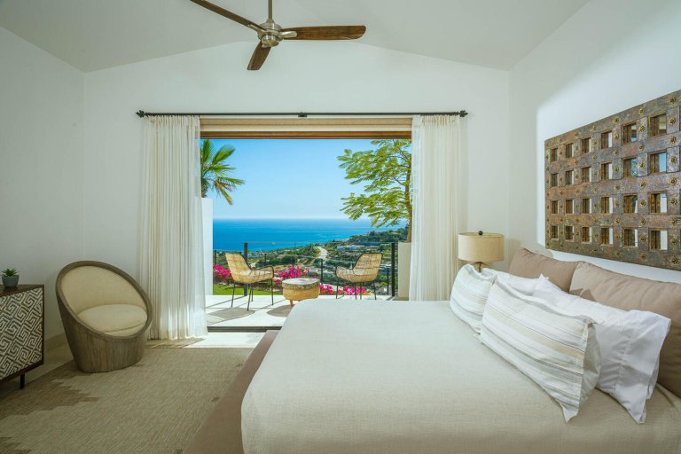 Multiple large sliding glass doors lead to the indoor space, where elevated ceilings make the home feel even larger. Natural hues of stone and wood are carried throughout the home, as the open floor plan incorporates a cozy L-shaped couch, a large wood dining table for 10, a curved breakfast bar with seating for four, a prep island, a large stainless-steel refrigerator, an espresso machine, and other upscale appliances. The light-filled home expands to include two areas that could be used for an office, and four bedrooms with king-sized beds, ensuite baths, and access to terraces with either ocean views or a private courtyard. The fifth bedroom has a loft-style setup with two doubles and two queens.