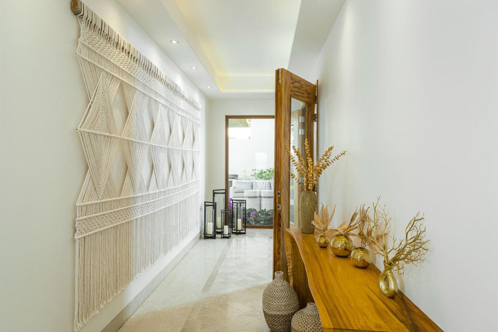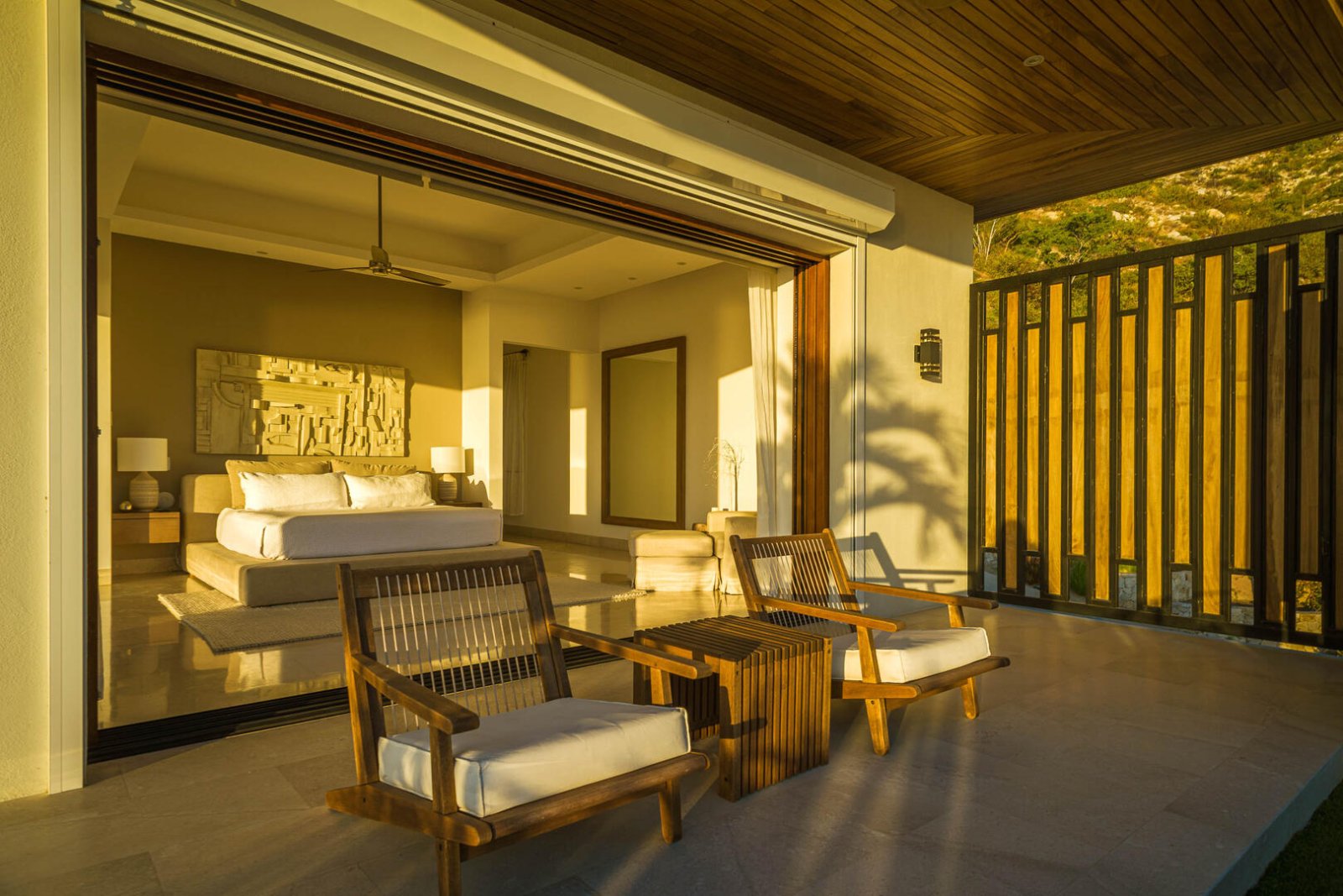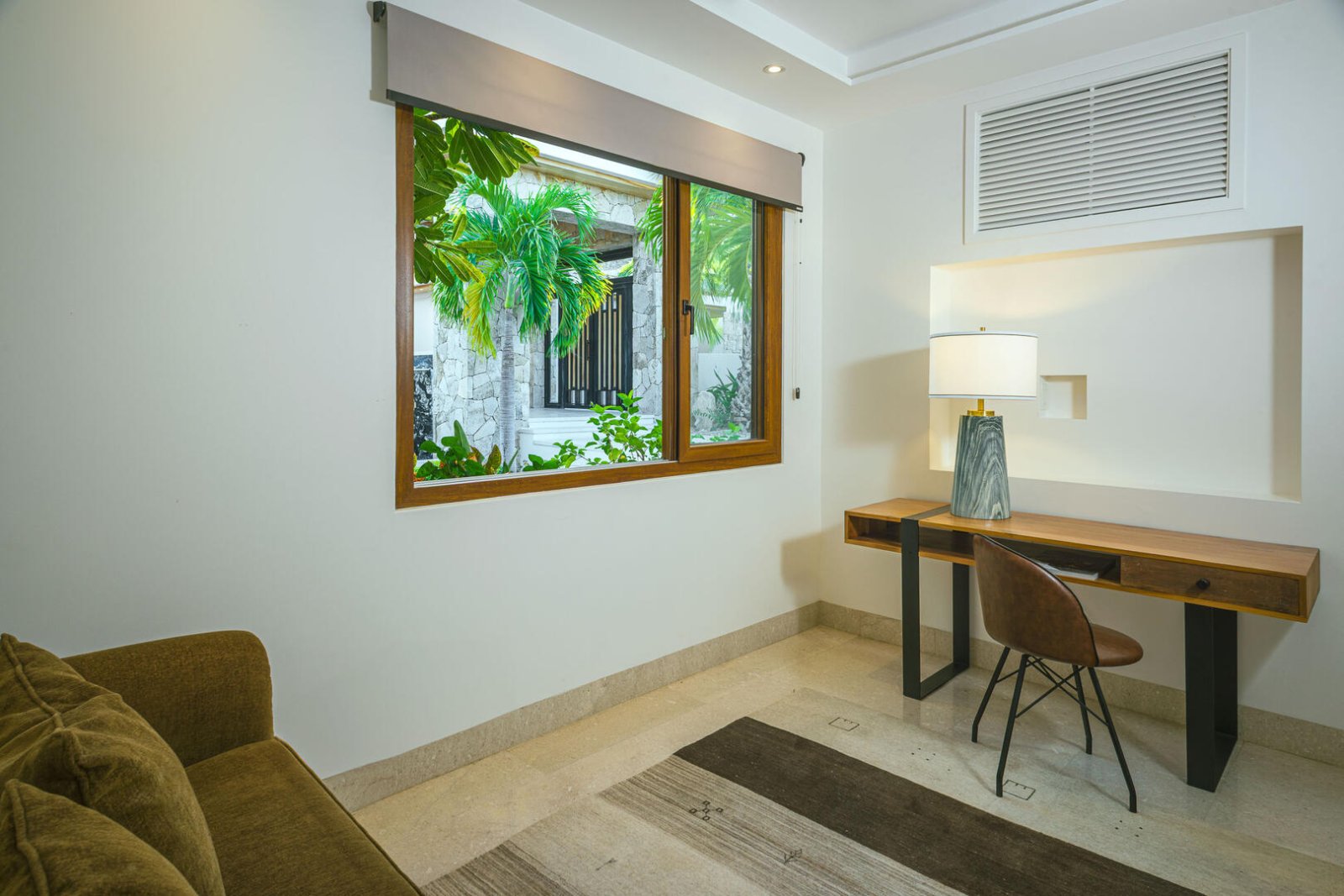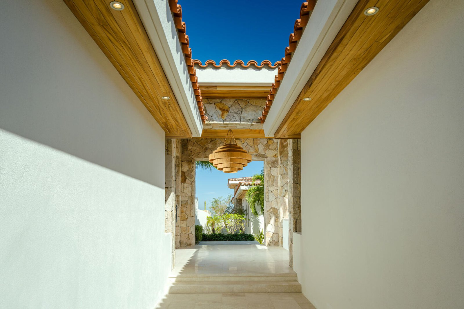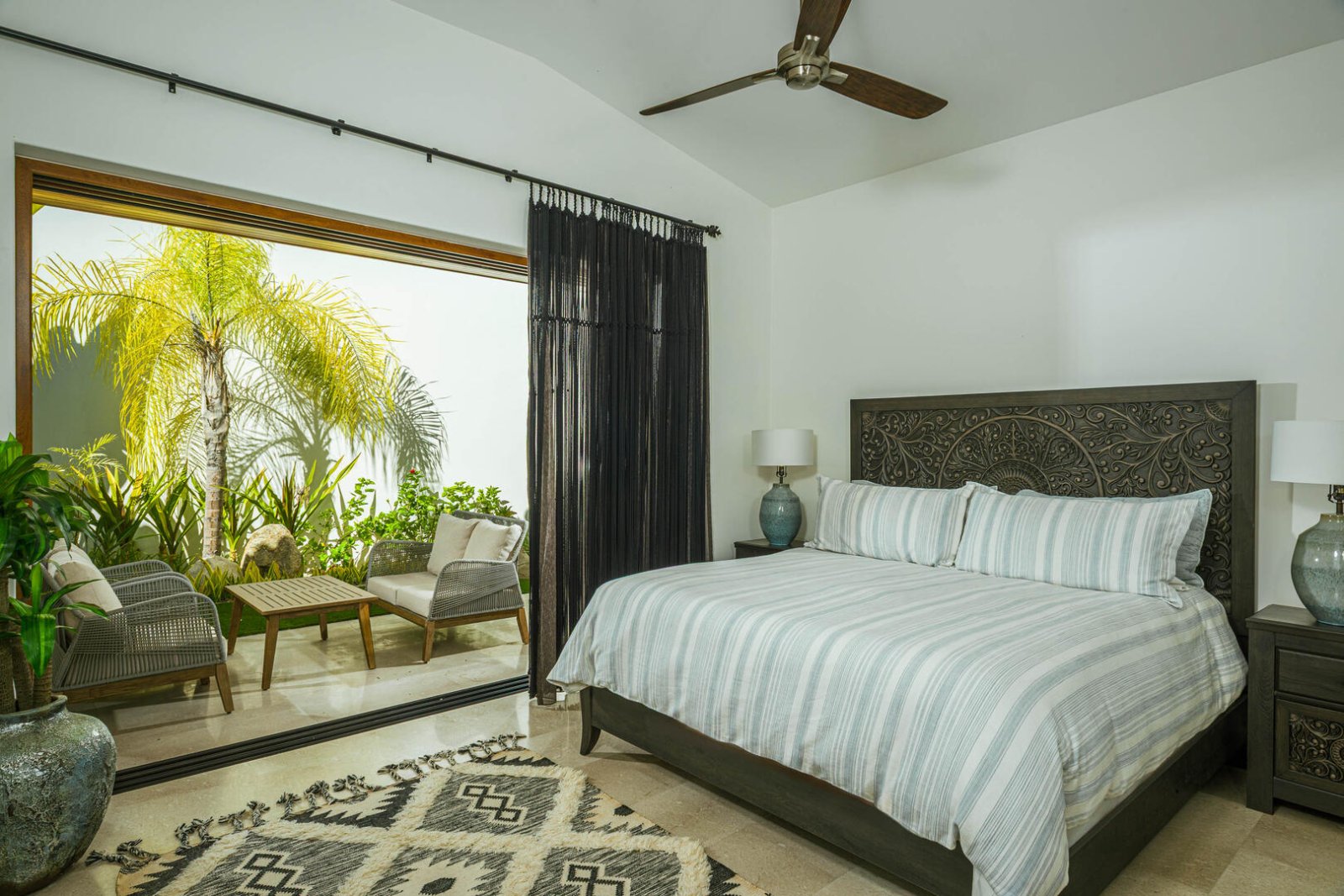 Multiple large sliding glass doors lead to the indoor space, where elevated ceilings make the home feel even larger. Natural hues of stone and wood are carried throughout the home, as the open floor plan incorporates a cozy L-shaped couch, a large wood dining table for 10, a curved breakfast bar with seating for four, a prep island, a large stainless-steel refrigerator, an espresso machine, and other upscale appliances. The light-filled home expands to include two areas that could be used for an office, and four bedrooms with king-sized beds, ensuite baths, and access to terraces with either ocean views or a private courtyard. The fifth bedroom has a loft-style setup with two doubles and two queens.