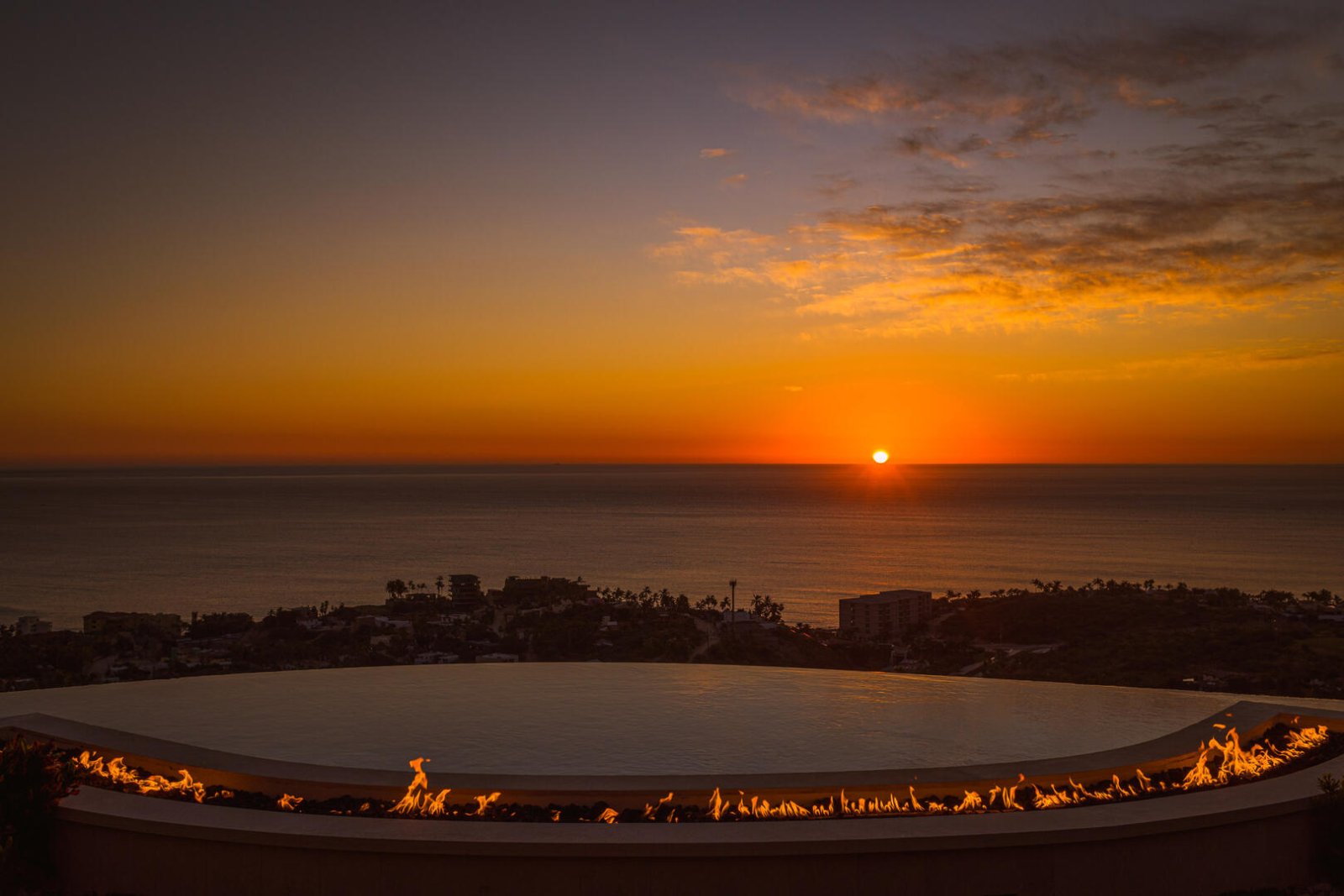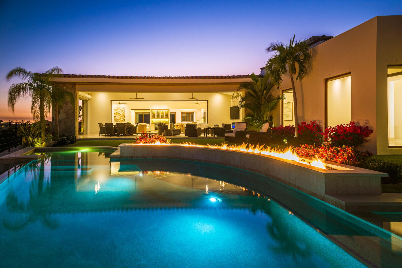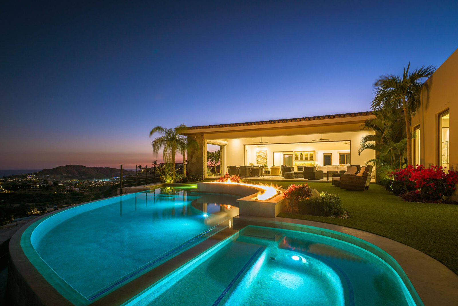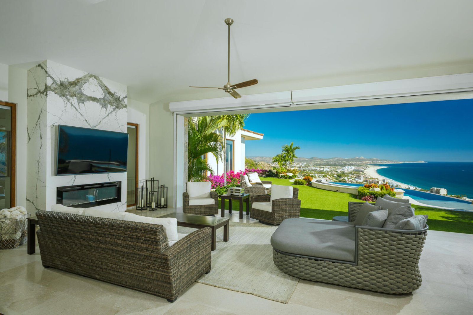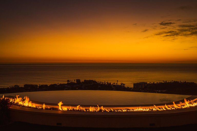 Designed to curve with the natural landscape of the hillside, the home's infinity pool delivers views down to the waterfront and sand below. The outside space also incorporates a landscaped pool area with swaying palm trees, a Jacuzzi, an outdoor stereo system, and a large, almost transitional indoor/outdoor living room that can open up on three sides with a flatscreen TV, lounge chairs and couches, a fireplace, and an outdoor dining table for eight. Additional outdoor space brings in a grilling area with nearby seating and a firepit overlooking ocean views.