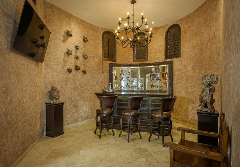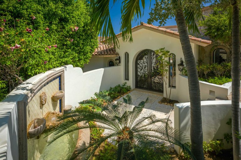 Architecturally stunning indoors and out, this 15,000 square foot home reveals inspiration from grand colonial haciendas with its signature terracotta tile roof, palatial columns, grand archways and exquisite stone and tile work throughout. Guests are welcomed to the home through the entranceway courtyard which features a lovely Spanish wall fountain and small garden dotted with palms and desert flora. Intricately-patterned wrought iron doors open into the bright, sun-filled interior of the villa.