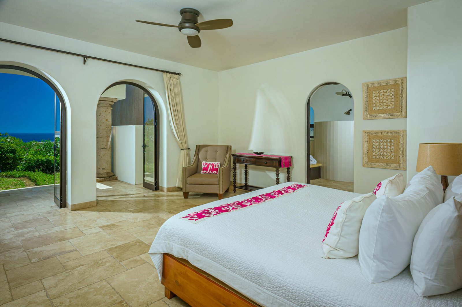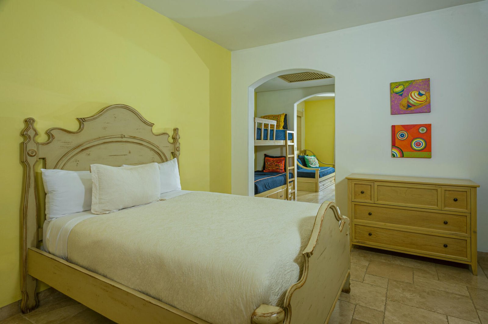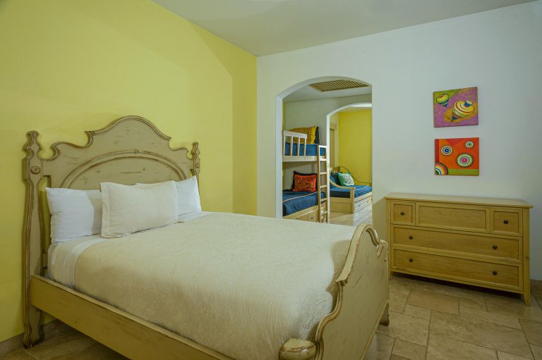 From romance to whimsy, tropical cool to Mexican charm, each bedroom suite at Villa de los Faros is beautifully decorated with its own unique design and mood. The four principal bedrooms have King beds, decadent ensuite baths, and most feature ocean views. There is a fun and vibrant children's suite with two Twin bunk beds, playful artwork, colorful linens, a table for activities and plenty of space to move around. For even more privacy, there is a separate casita with a Queen bed, ensuite bath, kitchenette and casual seating area.