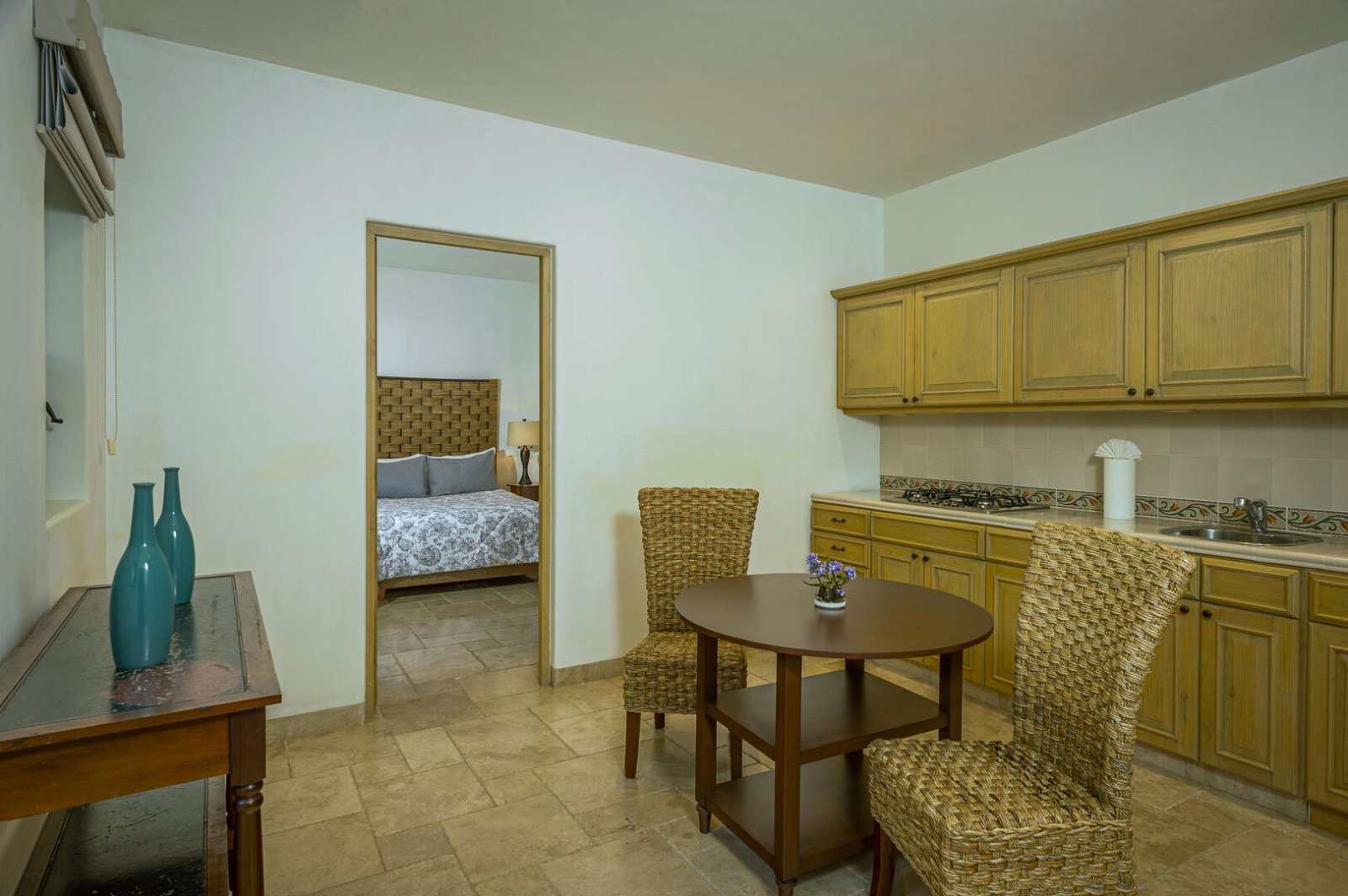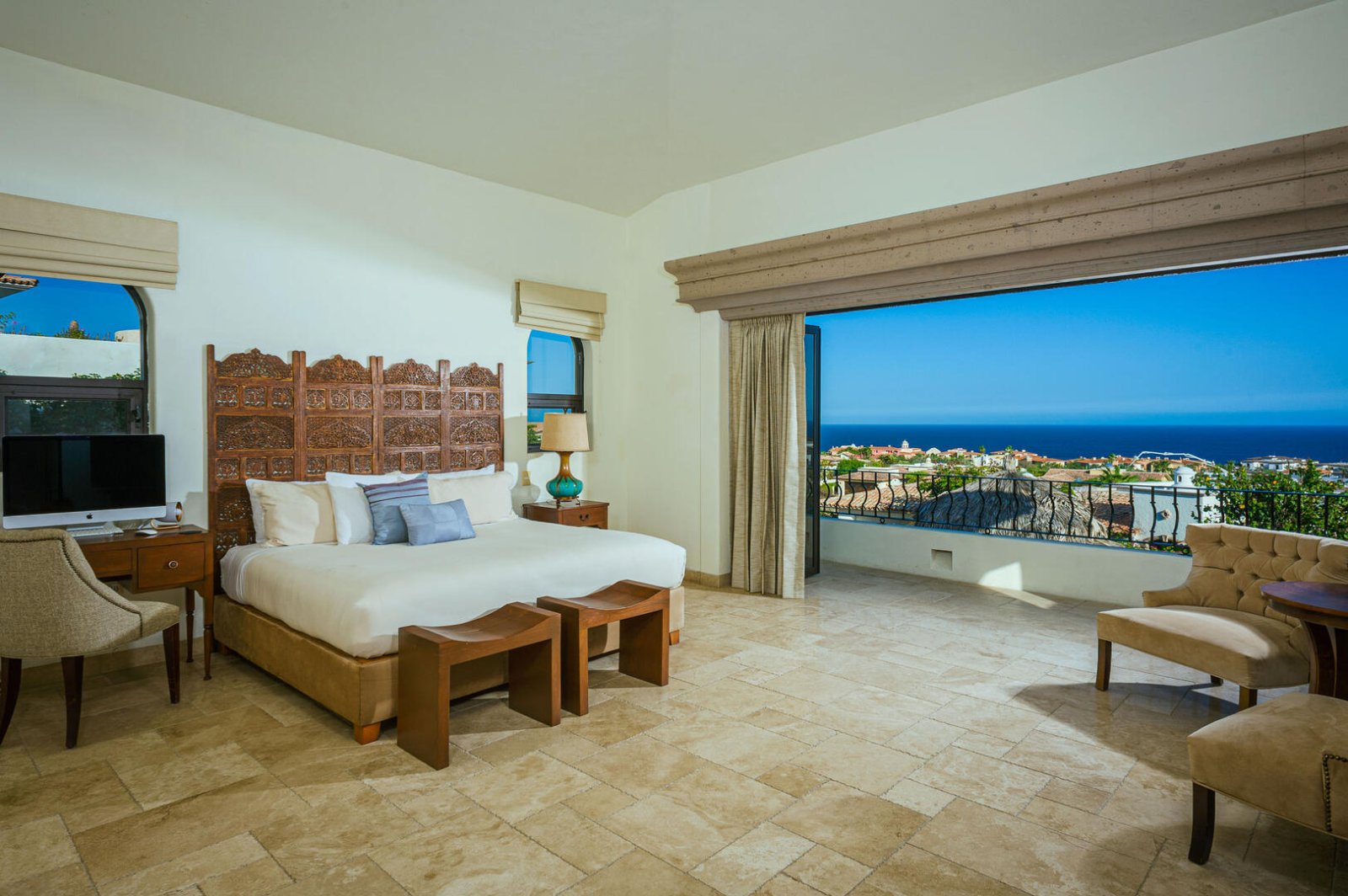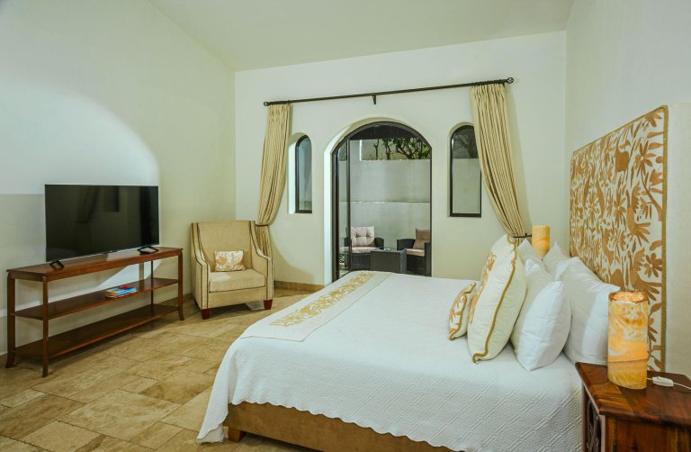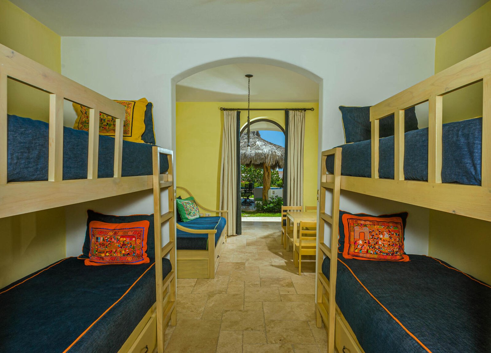 From romance to whimsy, tropical cool to Mexican charm, each bedroom suite at Villa de los Faros is beautifully decorated with its own unique design and mood. The four principal bedrooms have King beds, decadent ensuite baths, and most feature ocean views. There is a fun and vibrant children's suite with two Twin bunk beds, playful artwork, colorful linens, a table for activities and plenty of space to move around. For even more privacy, there is a separate casita with a Queen bed, ensuite bath, kitchenette and casual seating area.