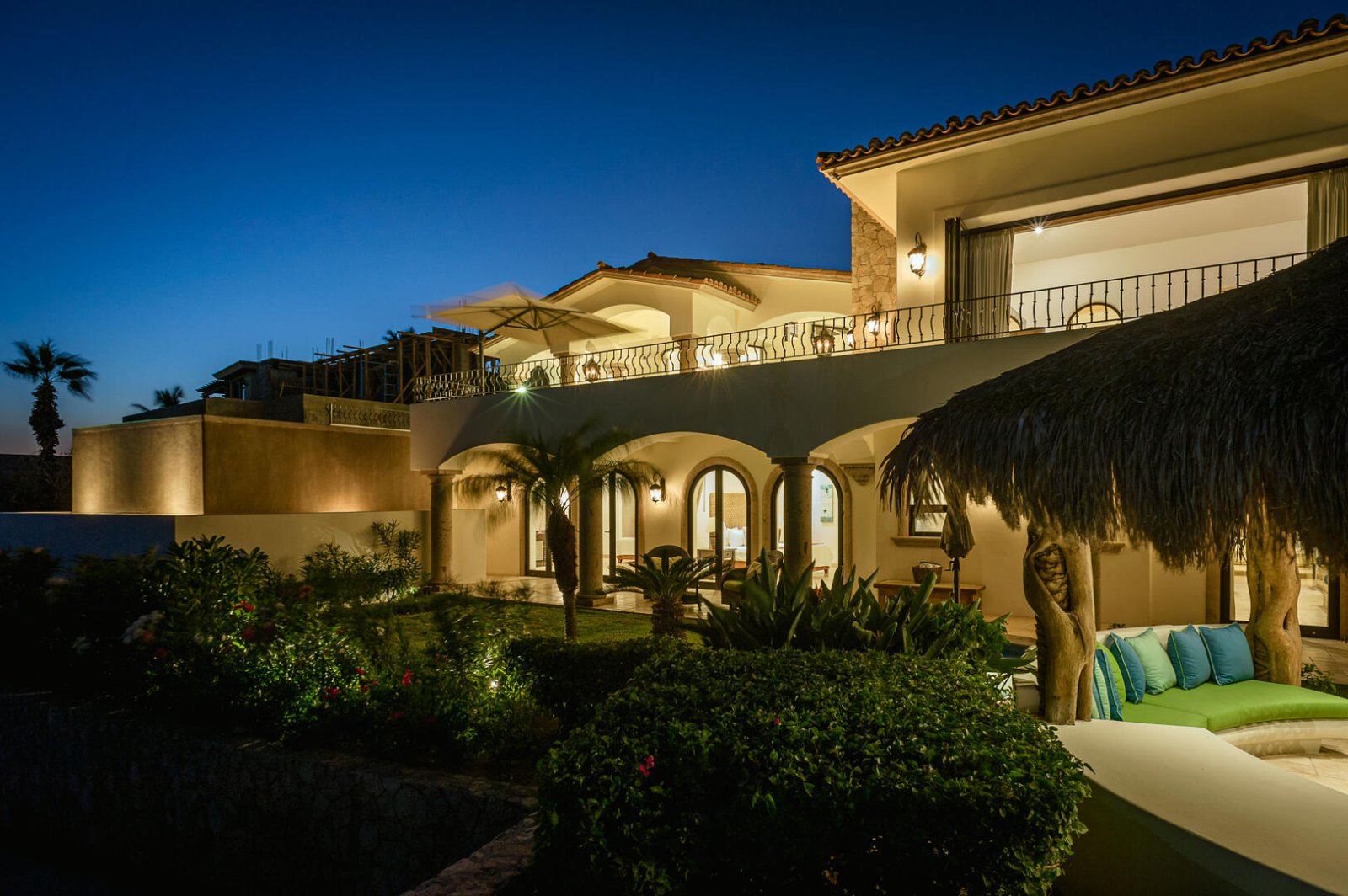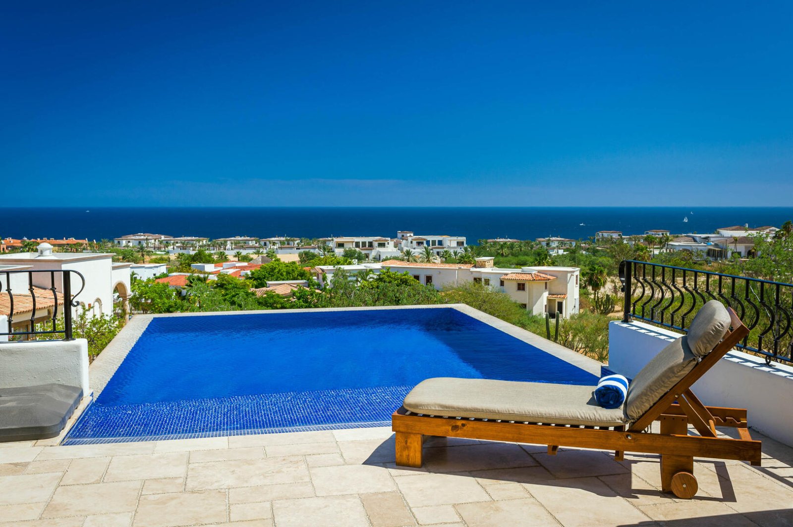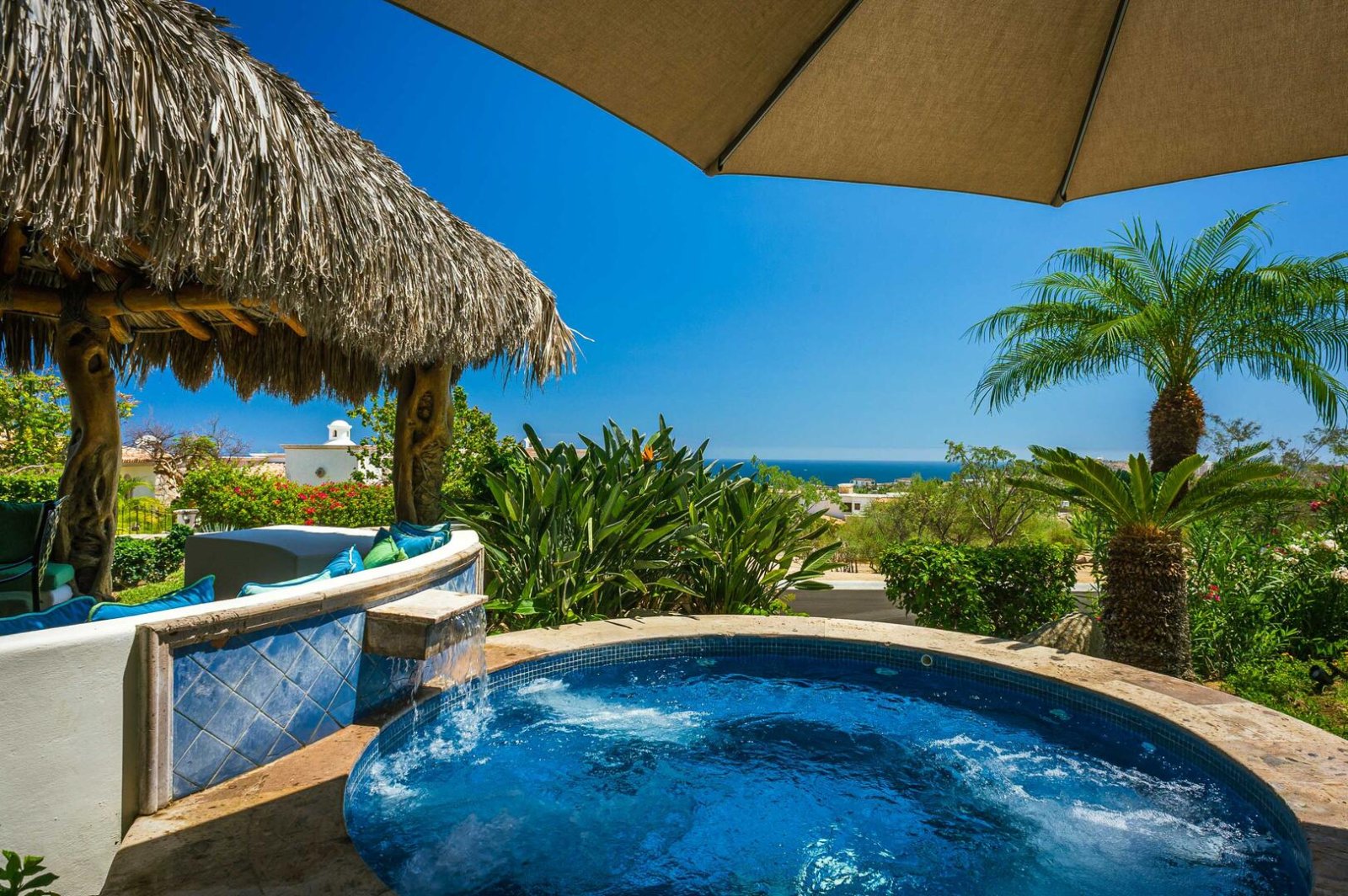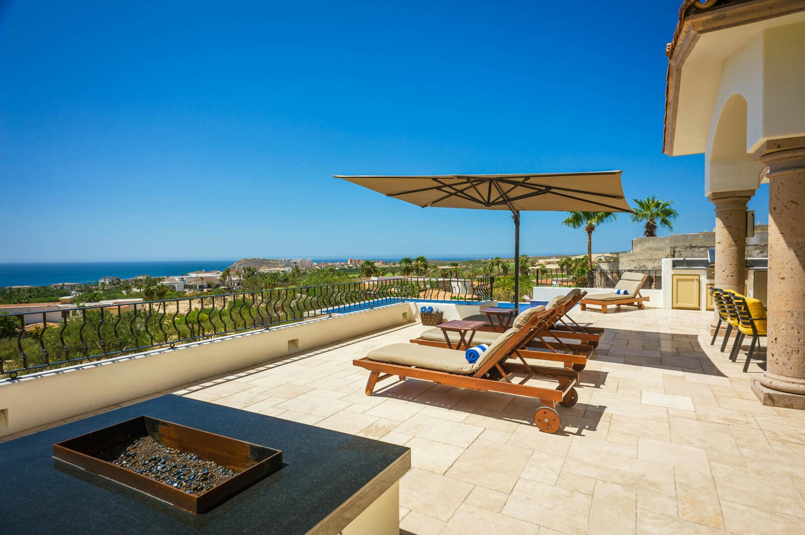 A spiral staircase in the great room leads down to the villa's second level of luxury living. French doors connect the bedrooms on this floor to a terrace which has a lush green lawn, a large Jacuzzi, and a traditional palapa shade covering an outdoor dining area with a table and wrap-around sofa seating. Tropical flowers and low-lying palms surround this terrace to create a naturally beautiful privacy hedge that doesn't distract from the stunning ocean views. On the upper-level terrace, there is a wet bar and grill station with a deluxe stainless steel gas BBQ, an outdoor dining table under the columned veranda, as well as several lounge areas where guests can relax under the warm Baja sun. A beach entry infinity pool extends out at the edge of the terrace, reaching toward the azure waters of the Cortez beyond.