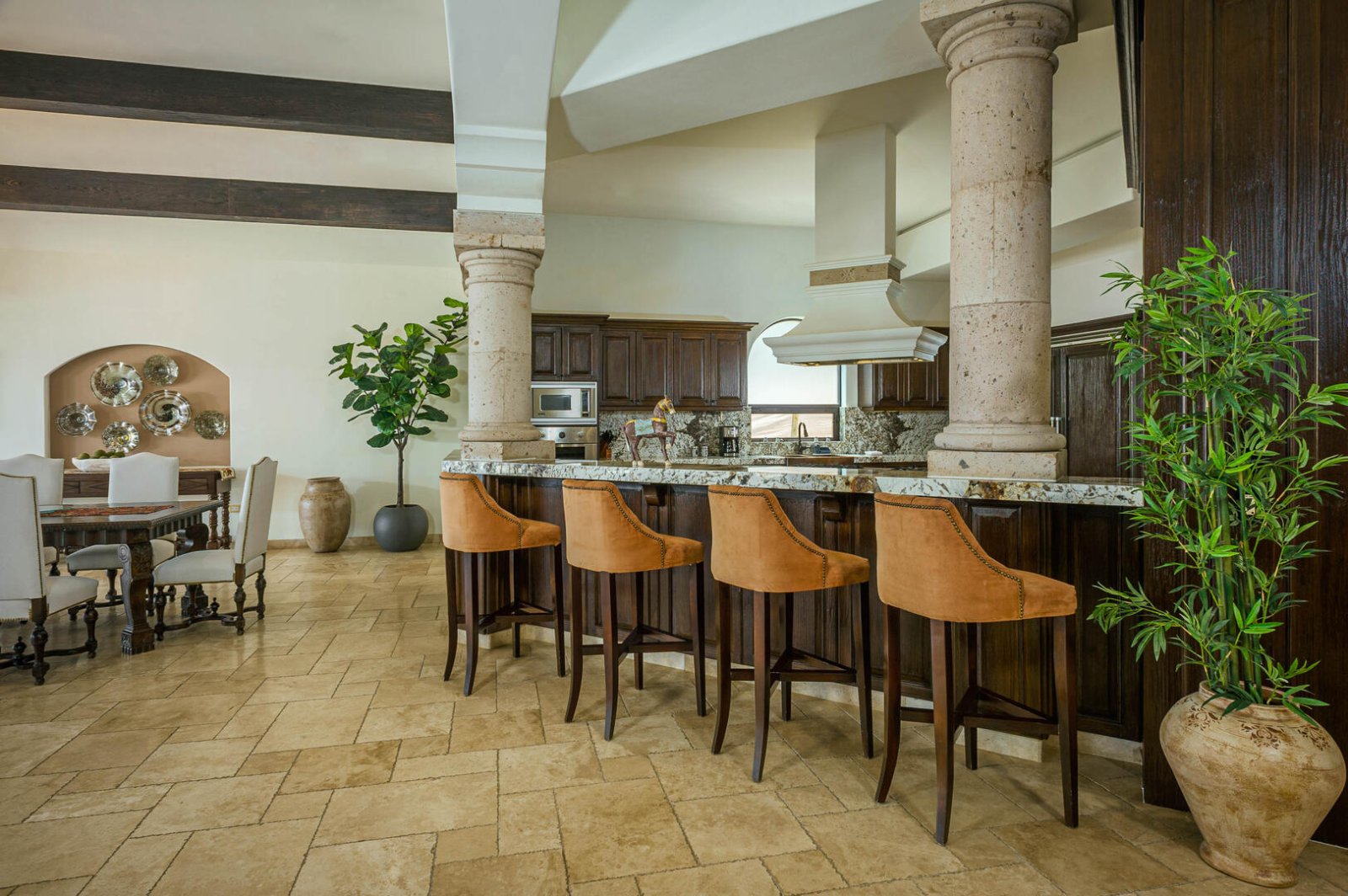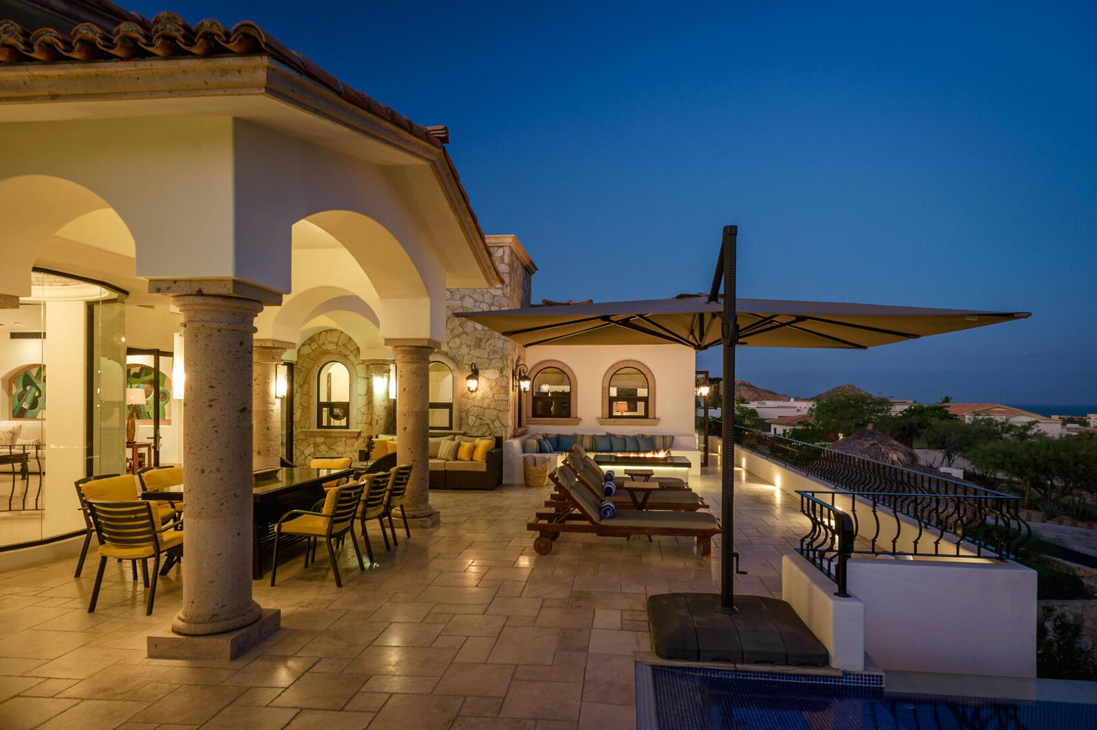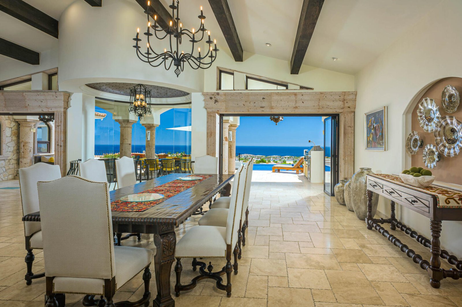 Guests will be wowed by the beauty of Villa de los Faros' majestic great room. Under the vaulted wood-beamed ceilings is a formal dining area with seating for eight, and a stylish sitting area adorned with niches covered in gorgeous tile mosaics. Two impressive stone archways open onto the terrace, framing breathtaking views of the Sea of Cortez.