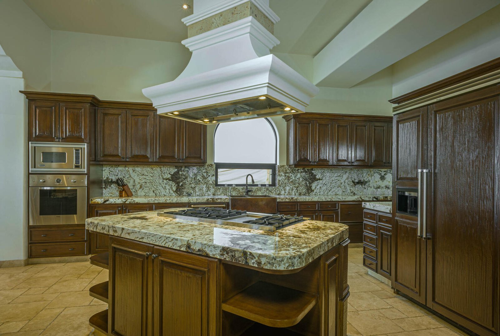 Next to the dining area, de los Faros' kitchen blends elegance and functionality to create the perfect space to host a lavish party or cook an intimate dinner. There is a large island with a double range gas stovetop, deluxe stainless steel appliances, a bar fridge and large apron-front sink, which are all surrounded by beautiful light maple cabinets, granite counters, and stone columns that add an elegant structural element to the space.