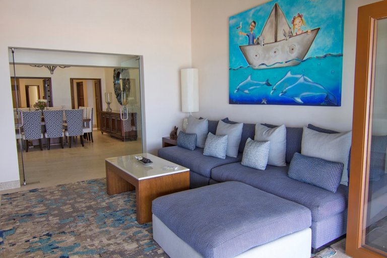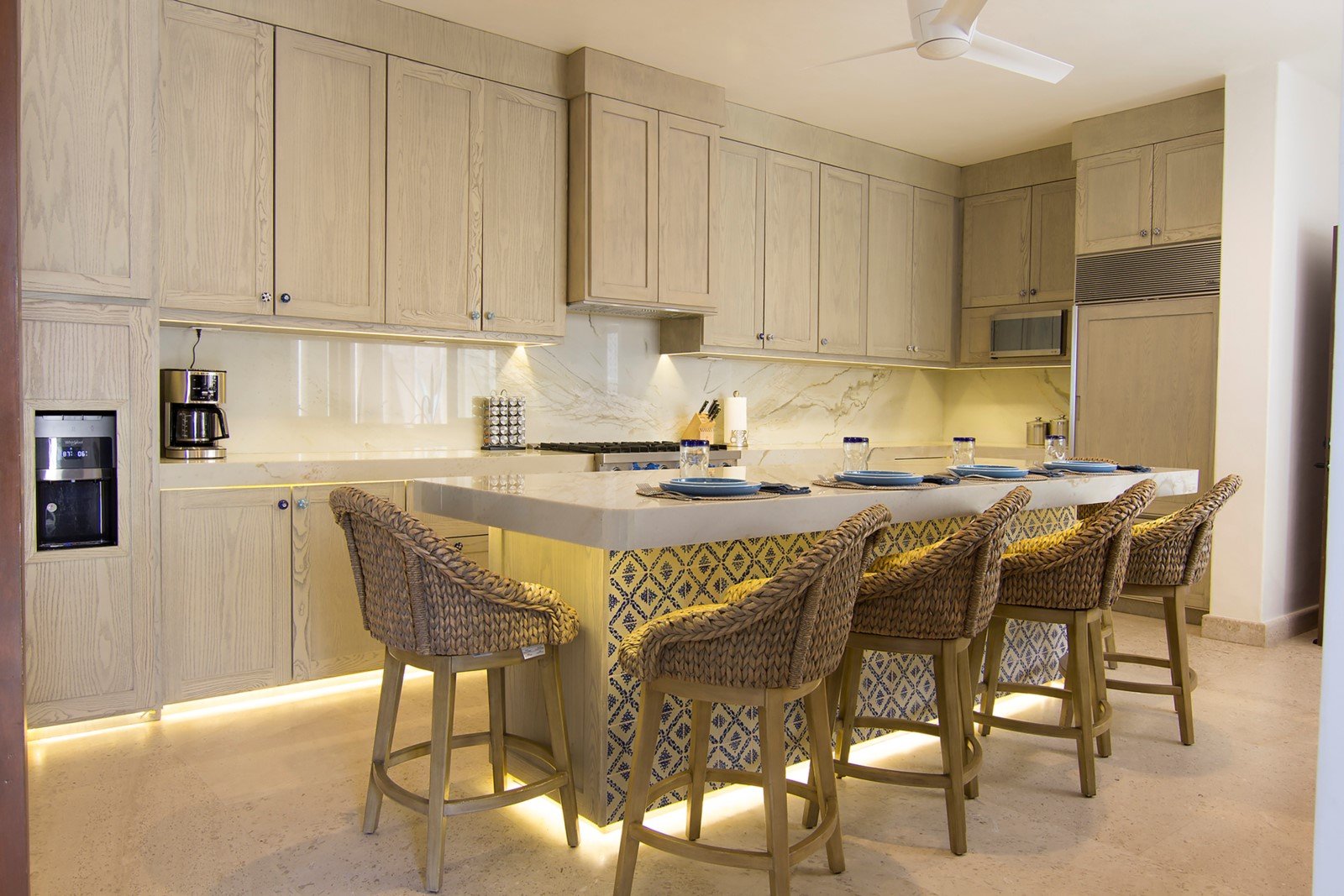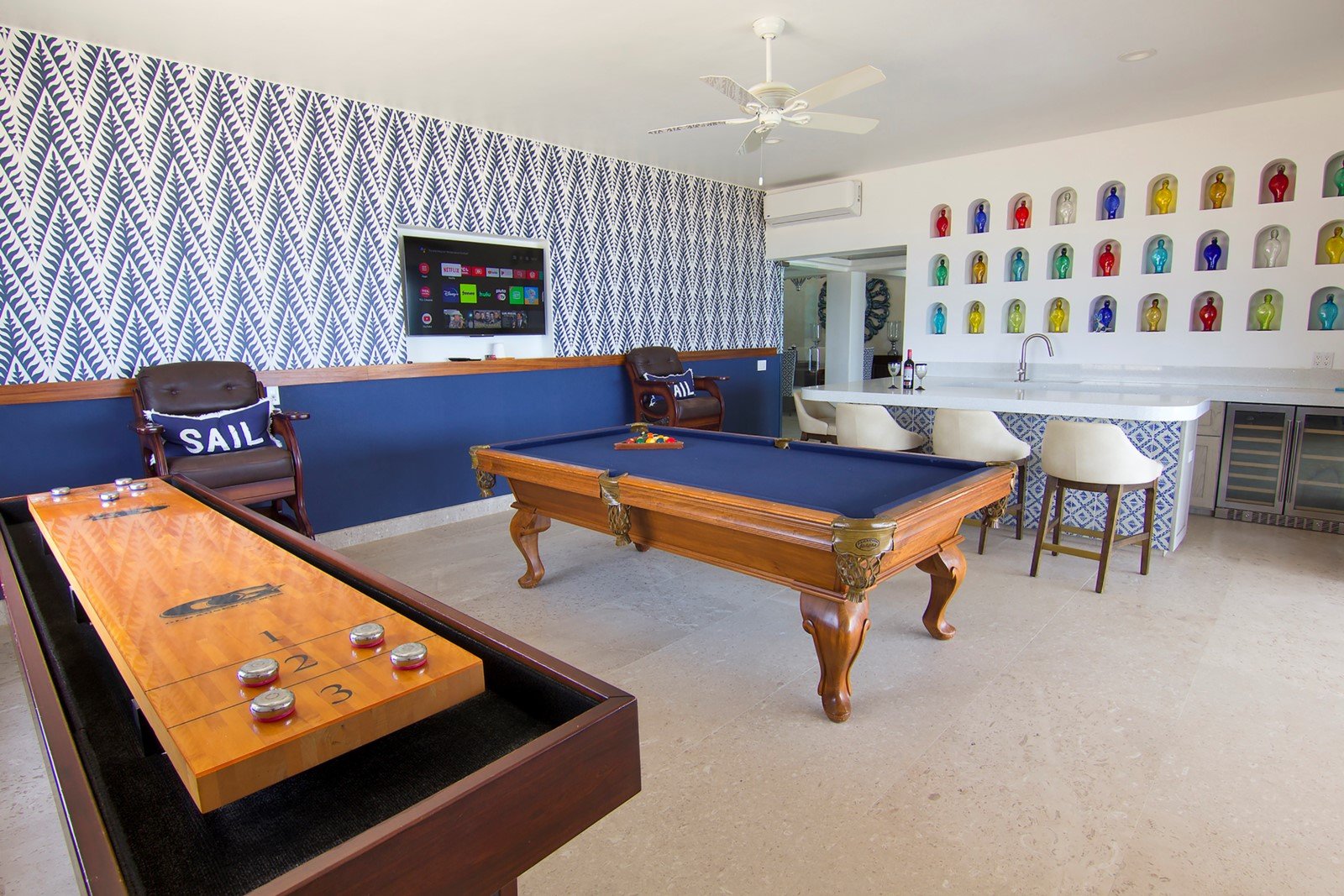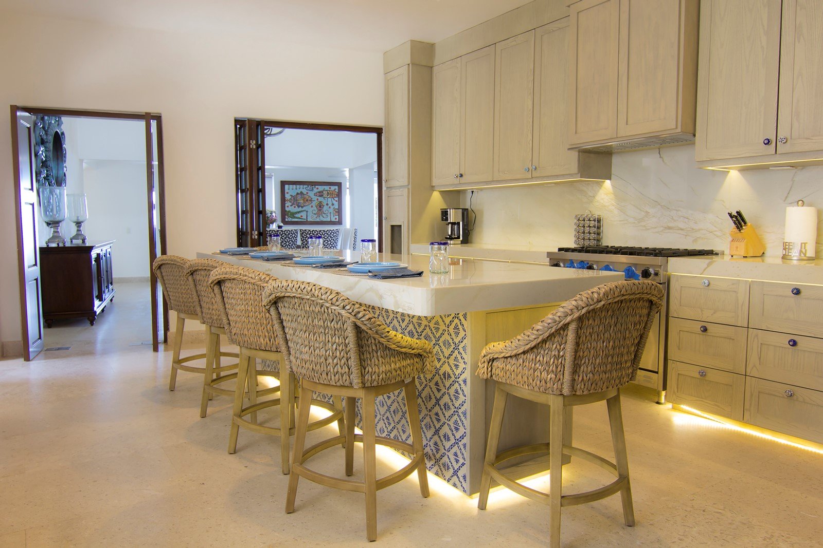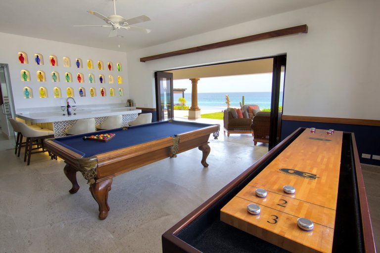 This home features a modern and elegant design, boasting beautiful artistic accents throughout. Luxurious details such as cantera stone flooring, granite and marble counter tops, vaulted ceilings, high-quality furnishings, and panoramic ocean views provide the home with a pleasant and tranquil atmosphere. This magnificent three-story villa offers a spacious living room, fully equipped gourmet kitchen, indoor/outdoor dining area, plus an entertainment room with a bar and pool table.
