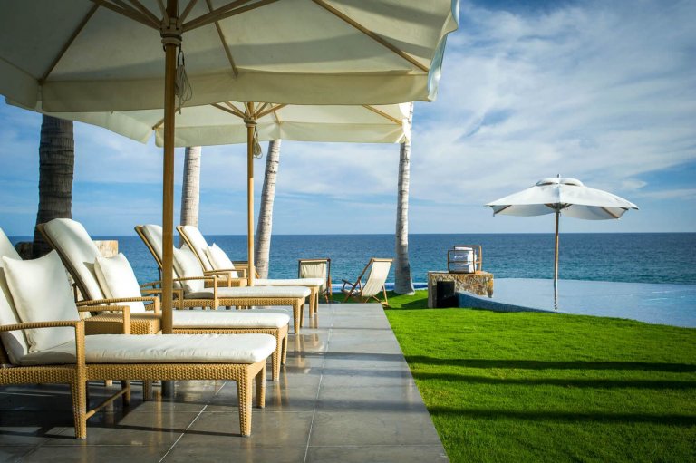 On the pool terrace above, the 100ft infinity pool seems to flow into the waters of the Cortez, creating a relaxing space to soak up the panoramic vistas of sea and sky.