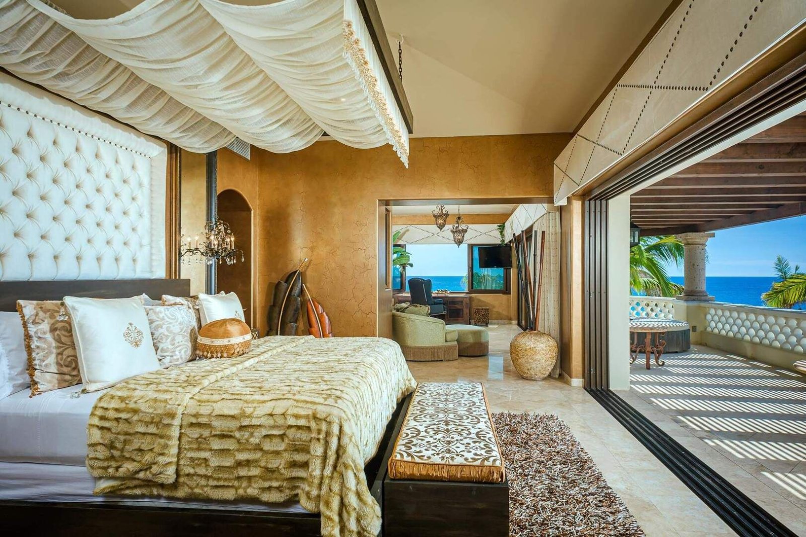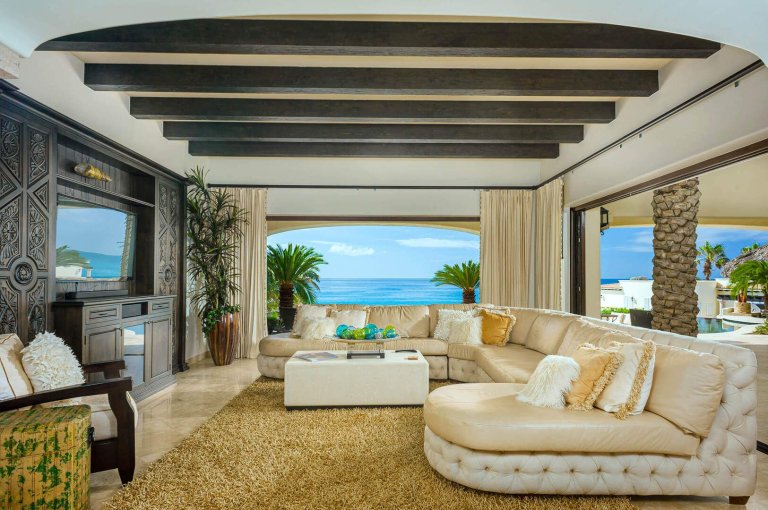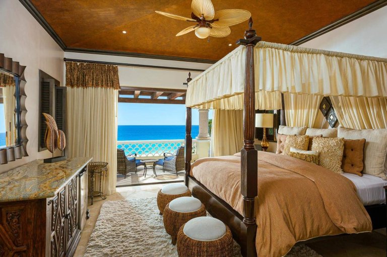 Sit back and relax in the sunken fire pit, right in the middle of the home's sparkling swimming pool with ocean views. The outdoor space also adds in a Jacuzzi, a shaded palapa with room for grilling, and some elegant outdoor dining and lounge space. Private terraces with ocean views accent many of the home's five ensuite bedrooms, providing the perfect, secluded spot to take in the beauty of the surrounding area as the sun comes up or sets for the day.