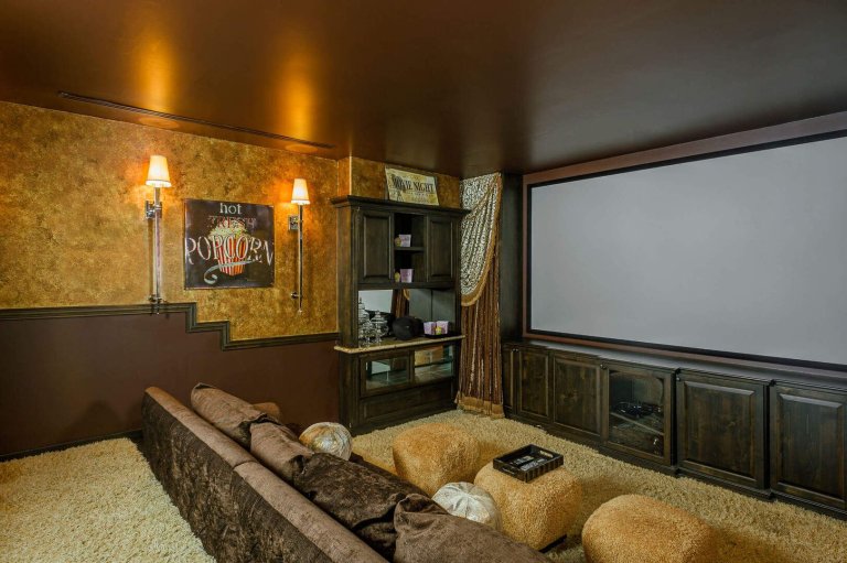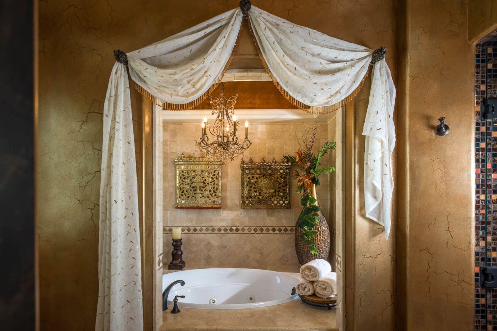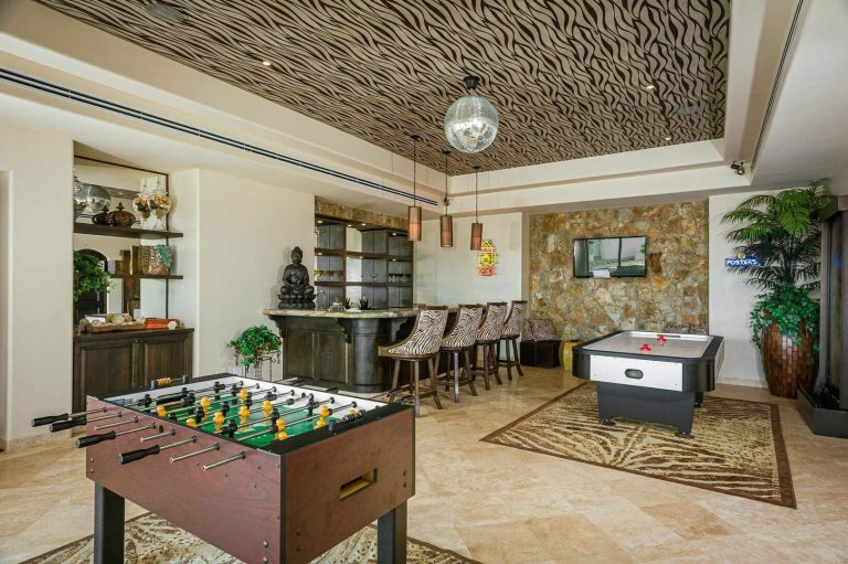 Back inside, the property treats up to 10 guests a vacation in true luxury, with an eat-in, gourmet kitchen, a personal home theater with an oversized screen, and a comfortable living room. As an added bonus, the family friendly home entertains guests with air hockey and foosball tables, a bar, and even a disco ball in its game room.